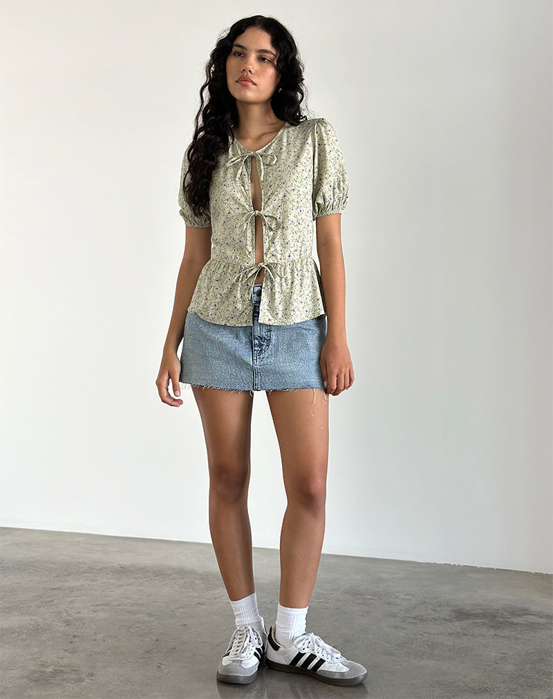 The Ajasi blouse in Parma violet with ditsy print on a season smart fabric base. A relaxed fit with a crew neckline and 3 keyhole openings with skinny self ties and puff sleeves.