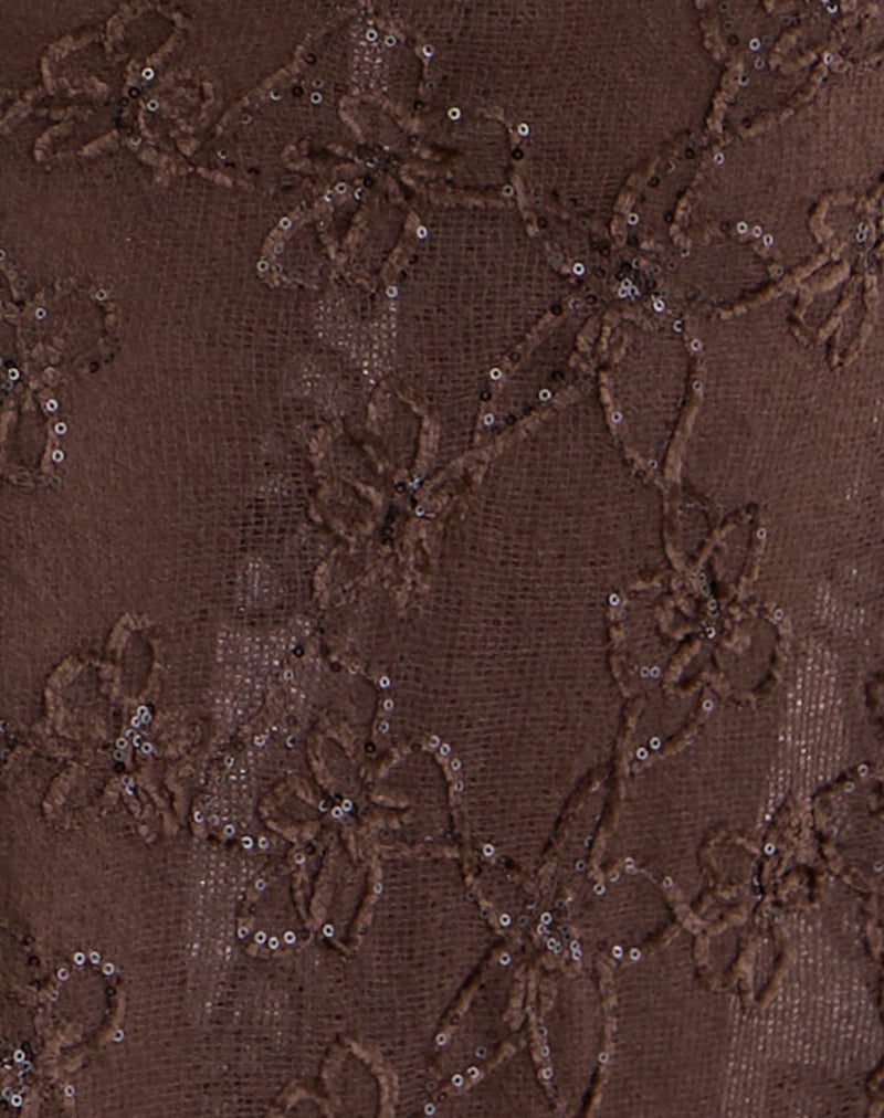 The Alphia skirt in a dark brown sequin knit fabric. Displaying a maxi style with a slight frill edge. Style with the matching Ruwi top.