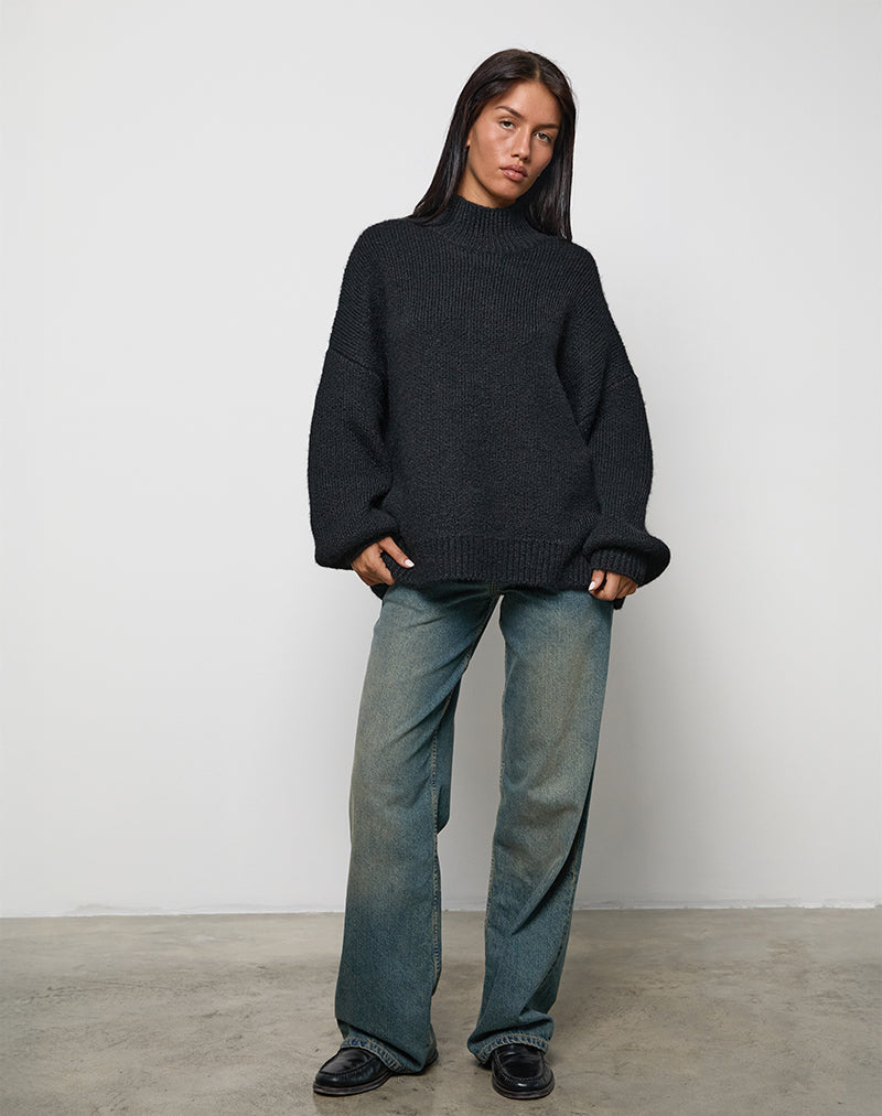 The Amato jumper displays an oversized fit and a turtle neck design. Finished in a black brushed knit fabric.