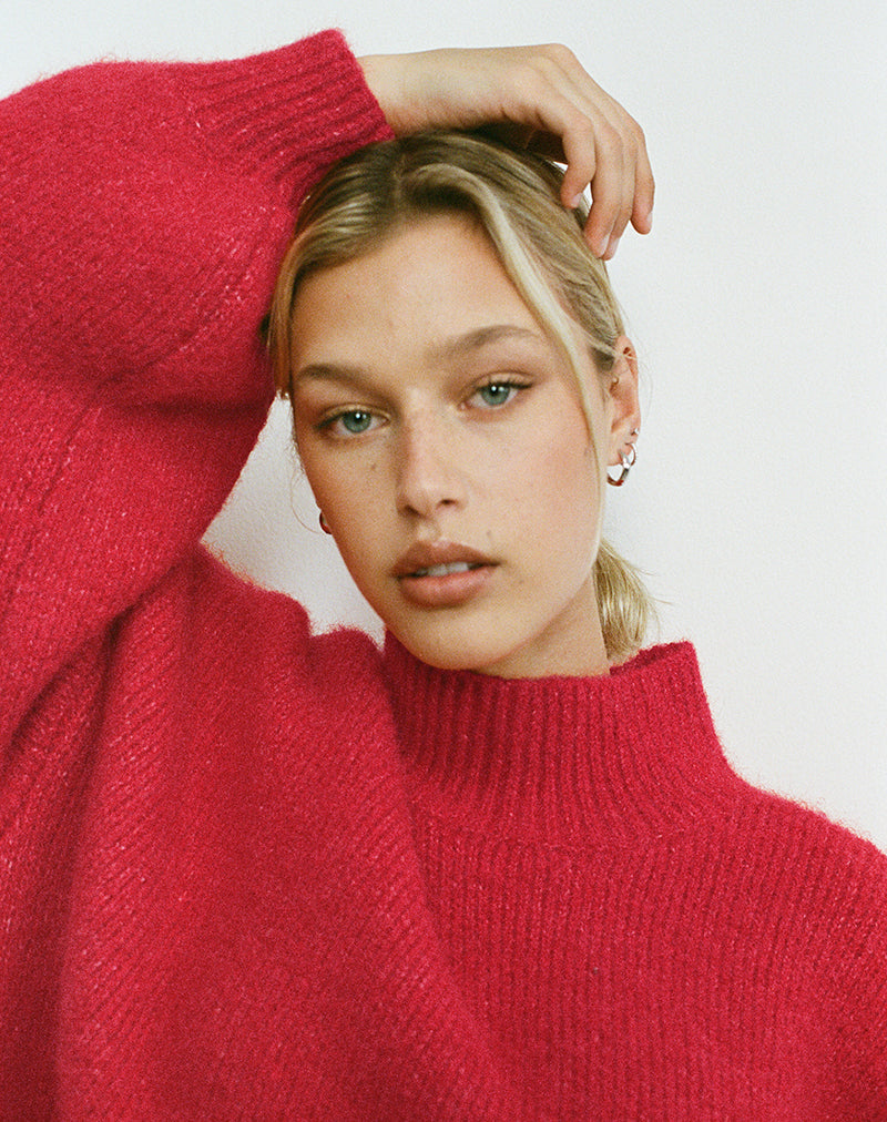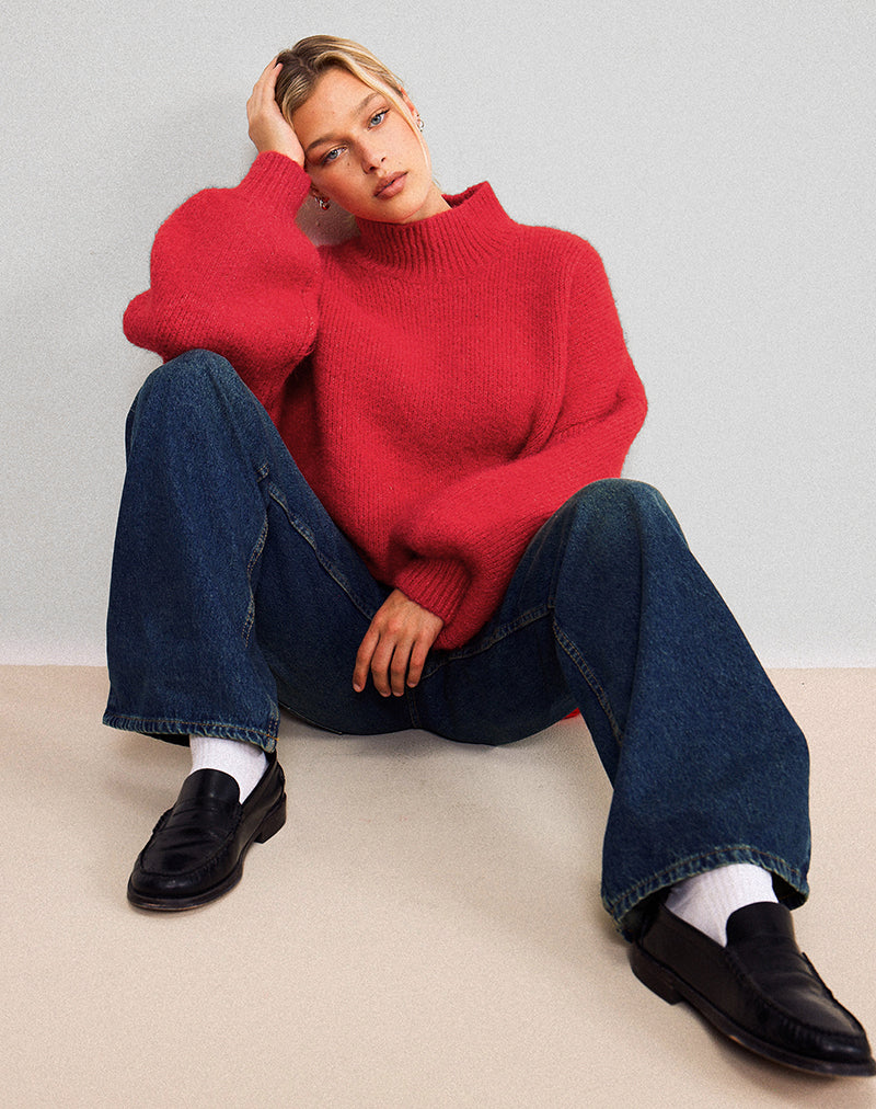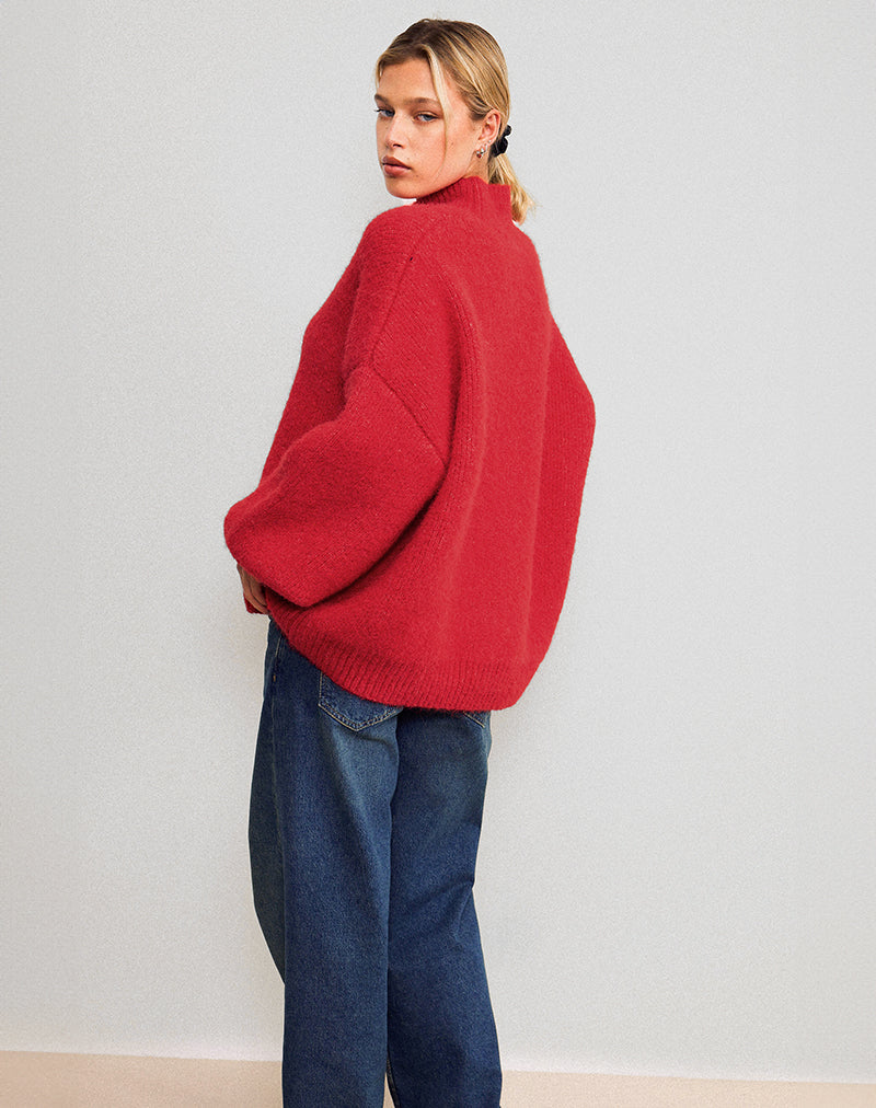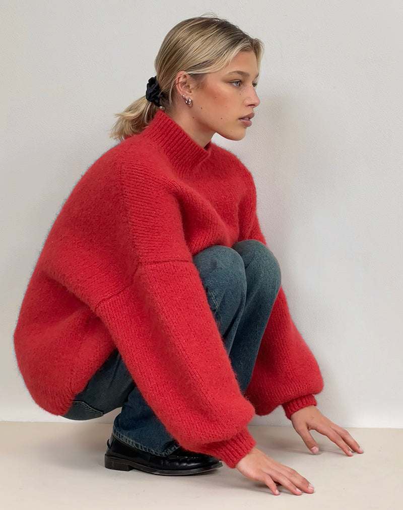 Add some colour to your knitwear with the Amato jumper. In a soft red knit, it features an loose, oversized fit with a high neckline and long balloon sleeves with cuffs. Style with a pair of Parallel jeans.