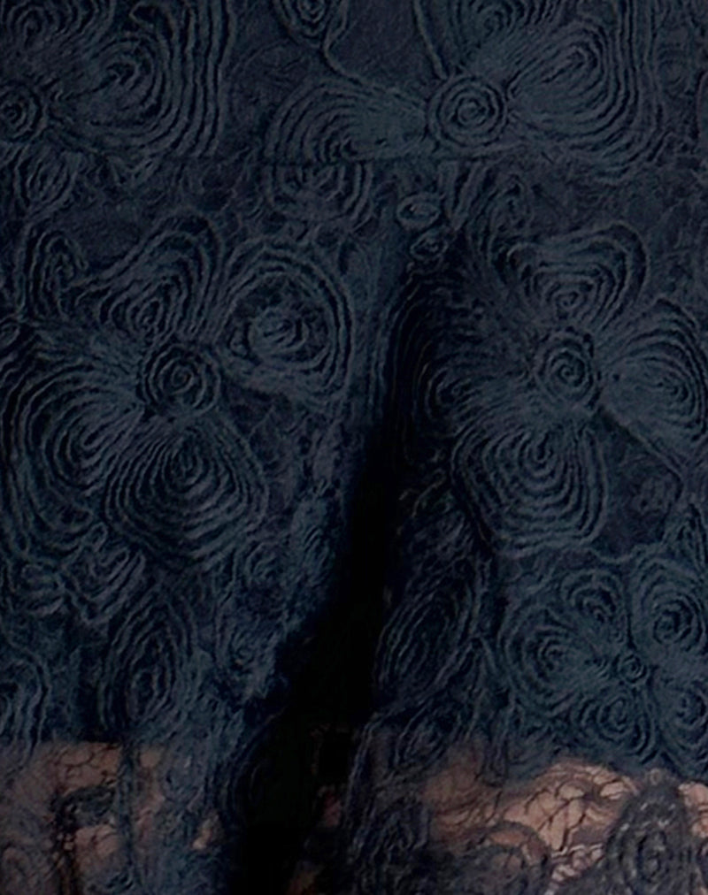 The Ambika dress in a textured rose lace black features a mini fit, drop waist with high, rounded neckline. Completed with a soft pleated bottom with double lining.
