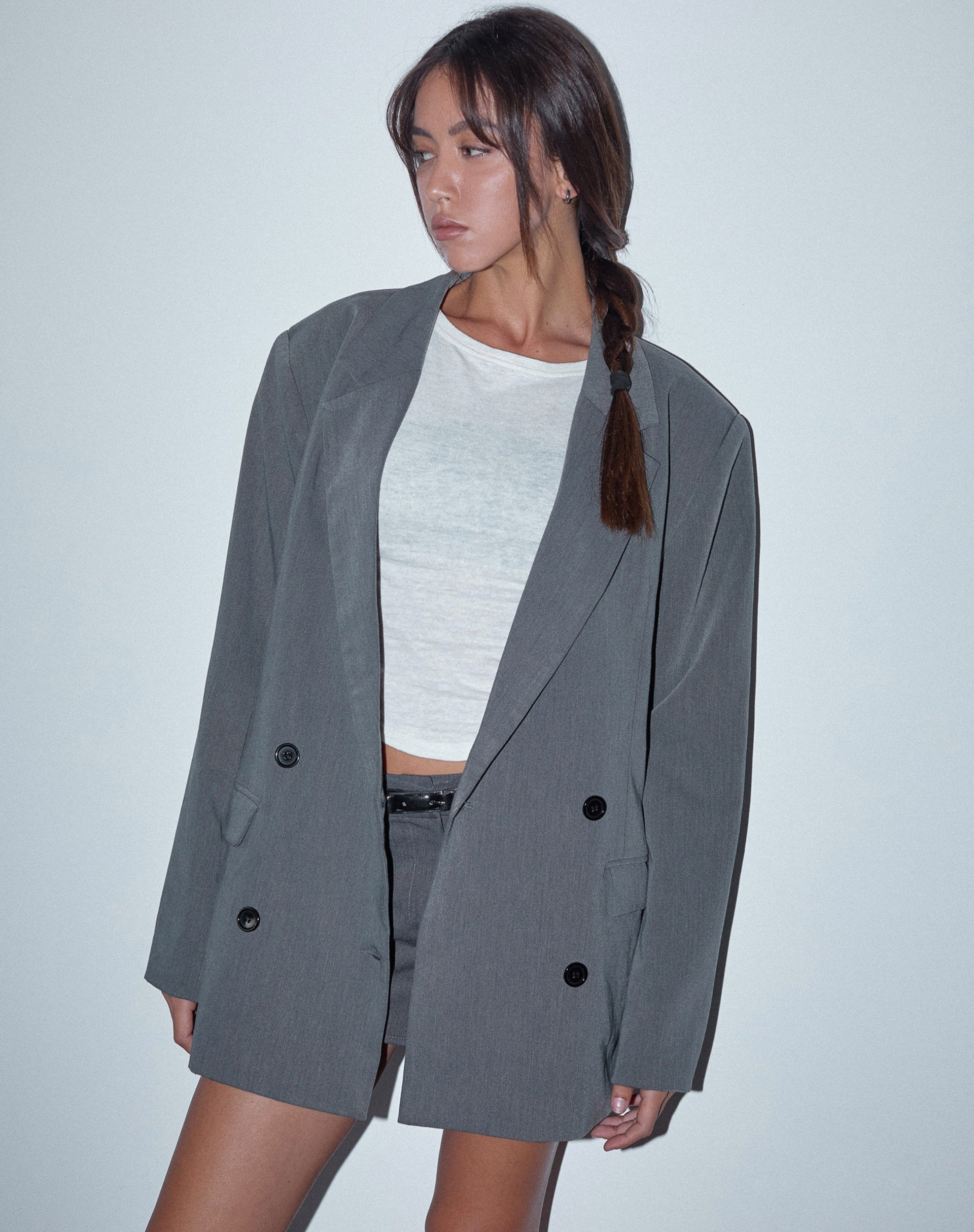 Level up your tailoring with our Ardea blazer. In charcoal, it offers an oversized, longline fit with long sleeves, a lapel collar and a double breasted button-up front. It also features front flap pockets and shoulder pads. Double up the look with the Sukra Skirt.