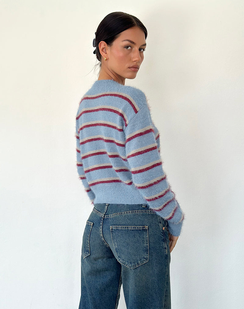 The perfect addition to your cardigan collection. The Audrina features a bodycon fit with long sleeves, a crew neckline and a button-up front in a blue and red stripe fluffy knit. Style with the black Keripa mini skirt.
