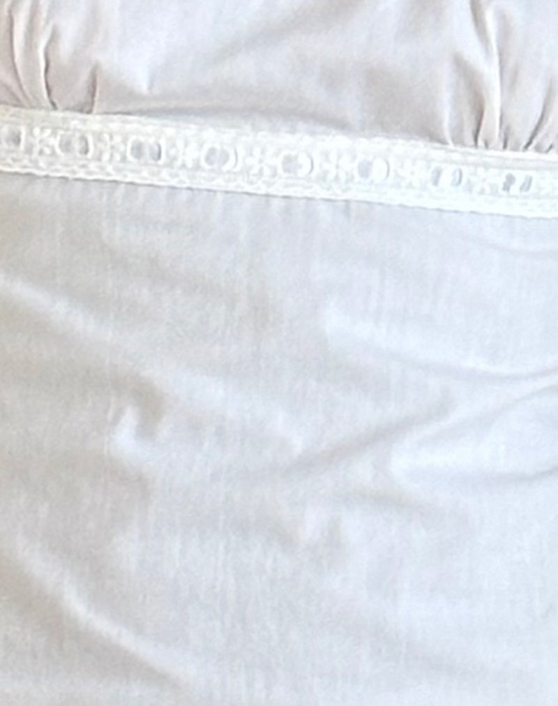 Bella features a mini fit with small puff sleeves, a deep scoop neckline and a loose fit skirt finished with a lace trim under-bust as well as on the hemline and neckline. Complete with frill and a picot trim along the hem in a white poplin non stretch cotton.