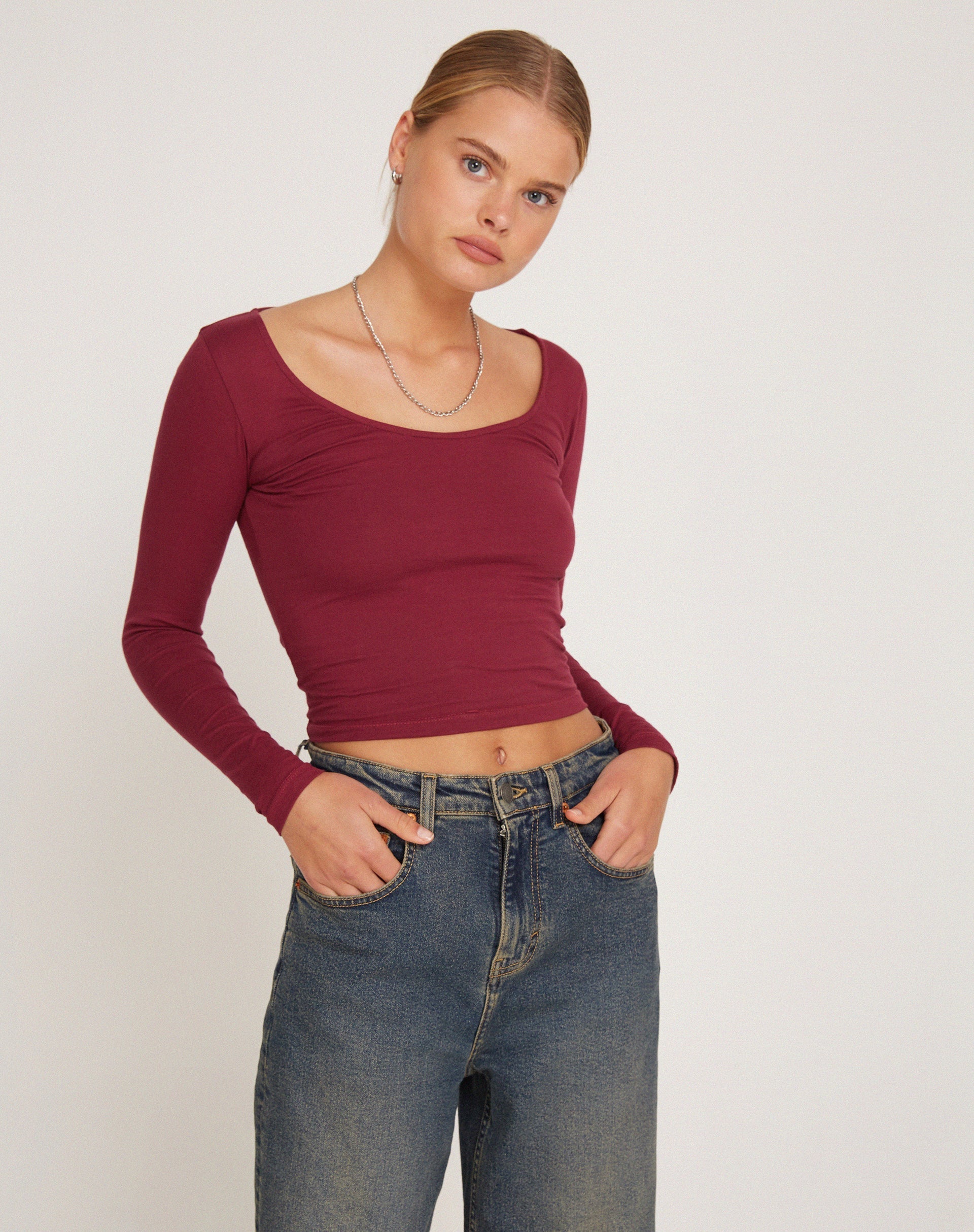 This bonlo top a basic essential. Featuring a cropped fit, long sleeves and a scoop neckline in plum. We love to style with our Roomy jeans.