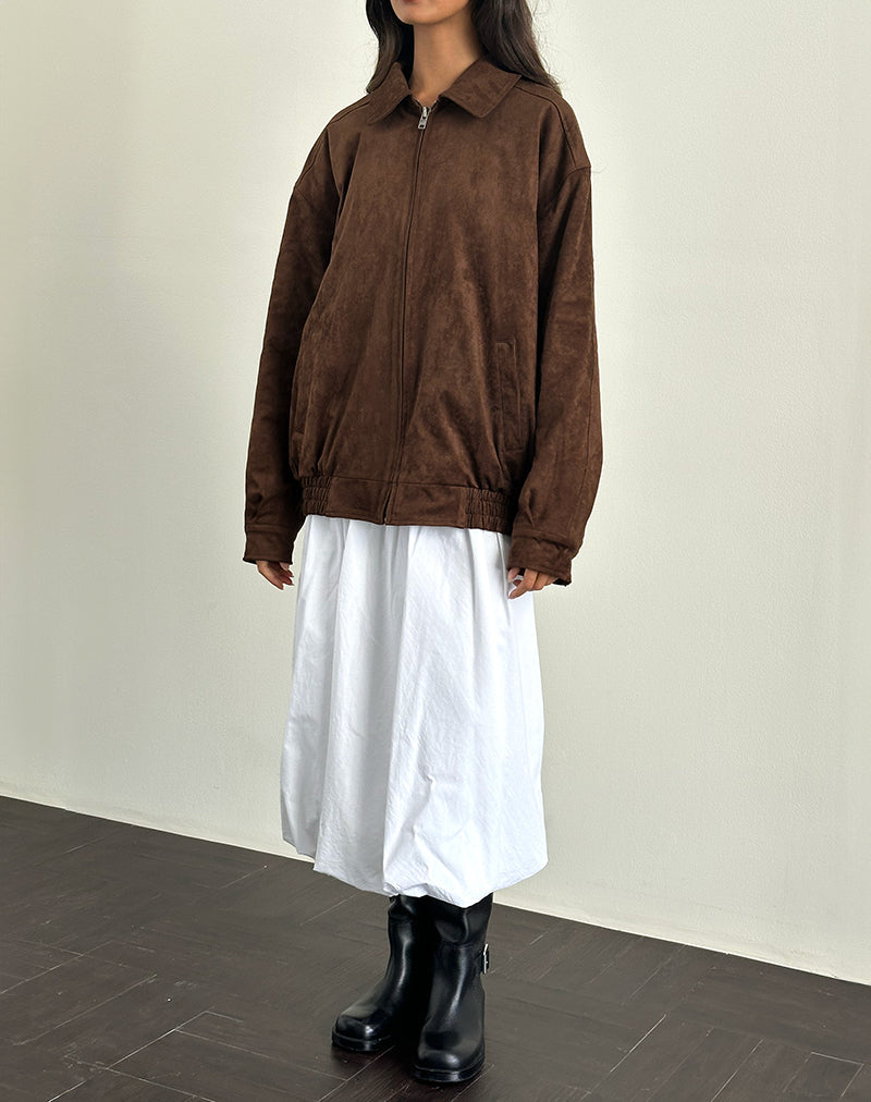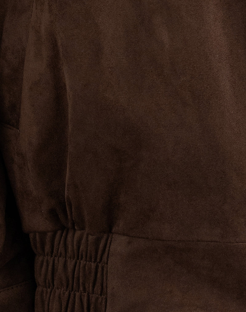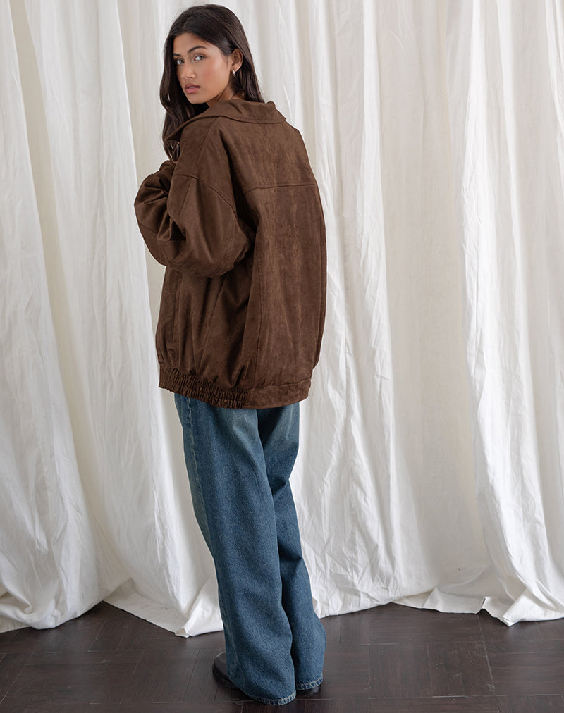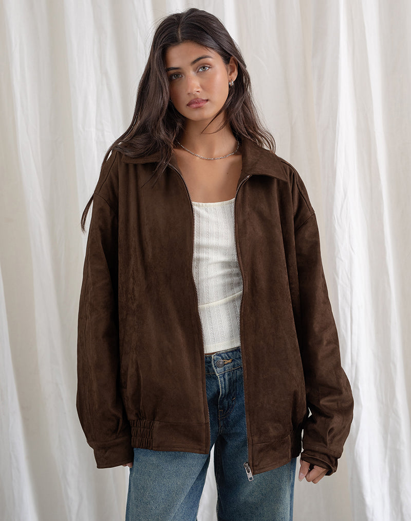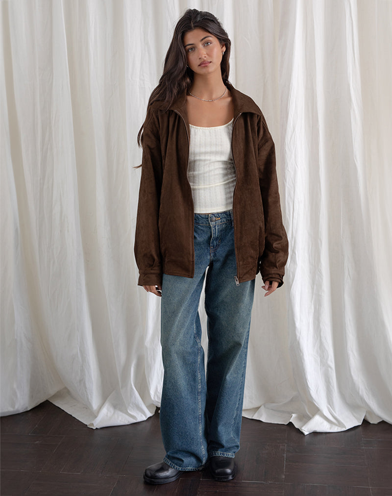 The perfect jacket for every season. Cavita features a boxy, oversized fit in a faux brown suede fabric with zip up front and lapel collar. Pair with our Kalinda vest and our Parallel jeans for a complete stylish look.