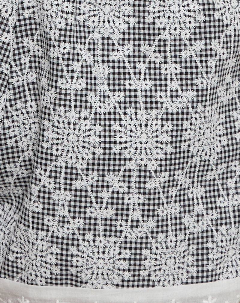 Charada short in black floral broderie fabric. Loose fit boxer style short with elasticated waistband and dolphin hem finished with a white broderie trim. Complete the look with white Shaelo bandeau top.