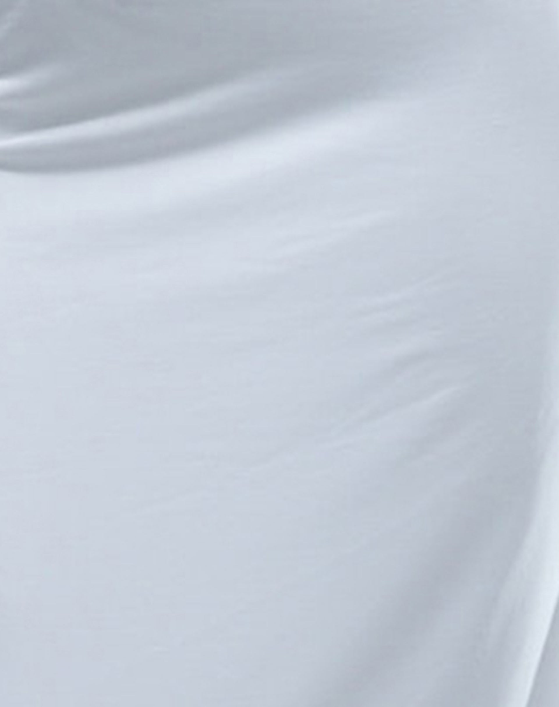 Low rise midi skirt with ruched detailed at waist featuring asymmetrical hem and split detail in ivory slinky material. For the perfect 'fit pair with our Inda top.
