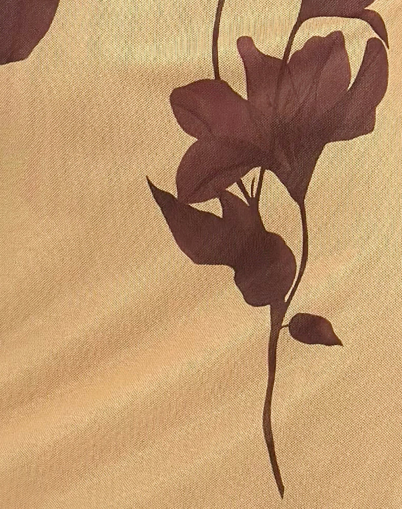 The Clooney mini dress in flower yellow brown print on a mesh fabric base. Boasting a halterneck tie neckline and an asymmetrical hemline. Complete with fringe detailing.