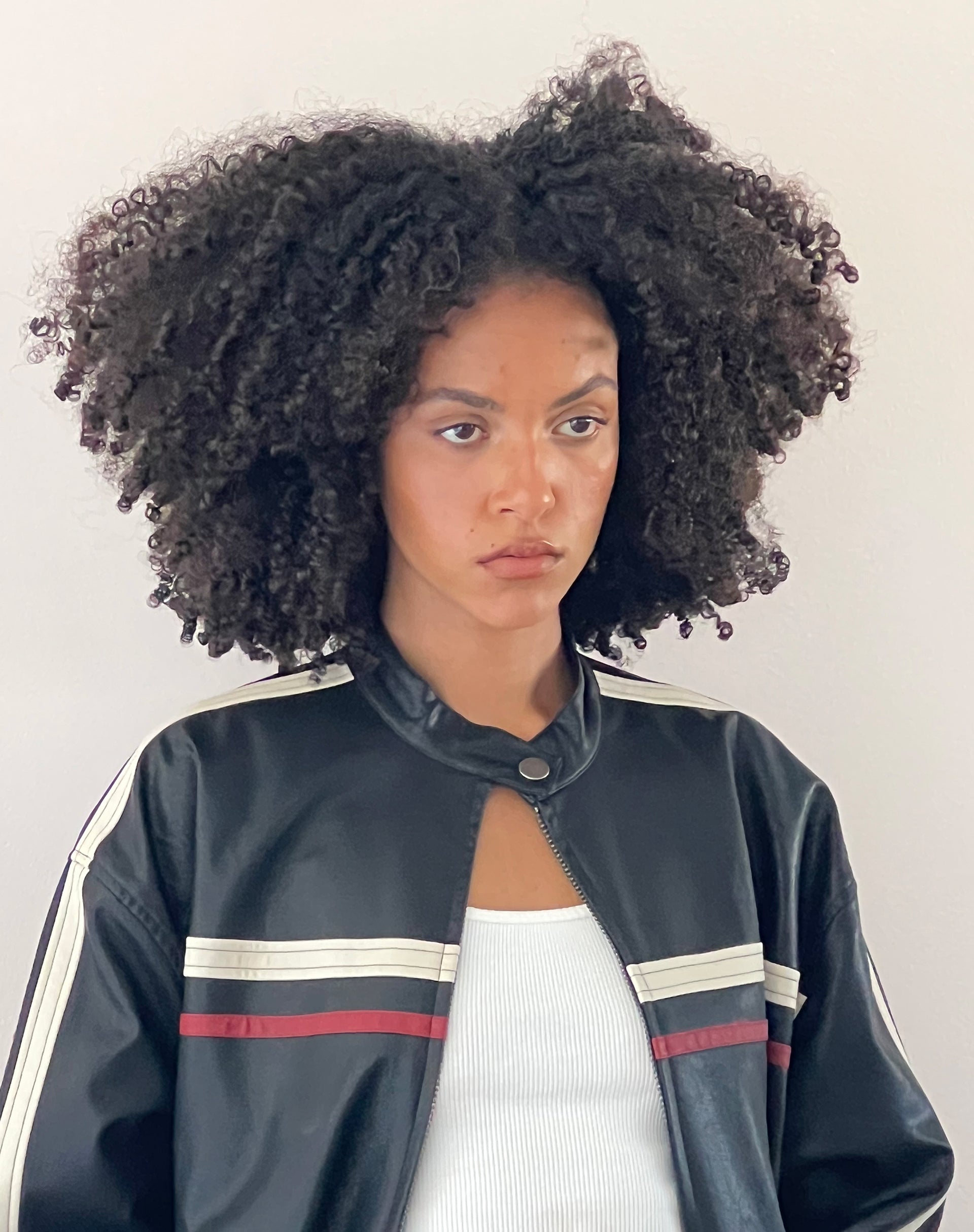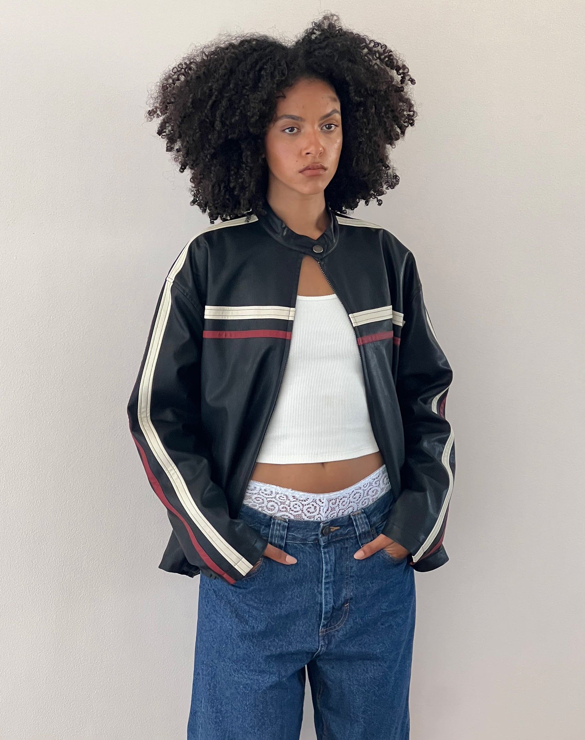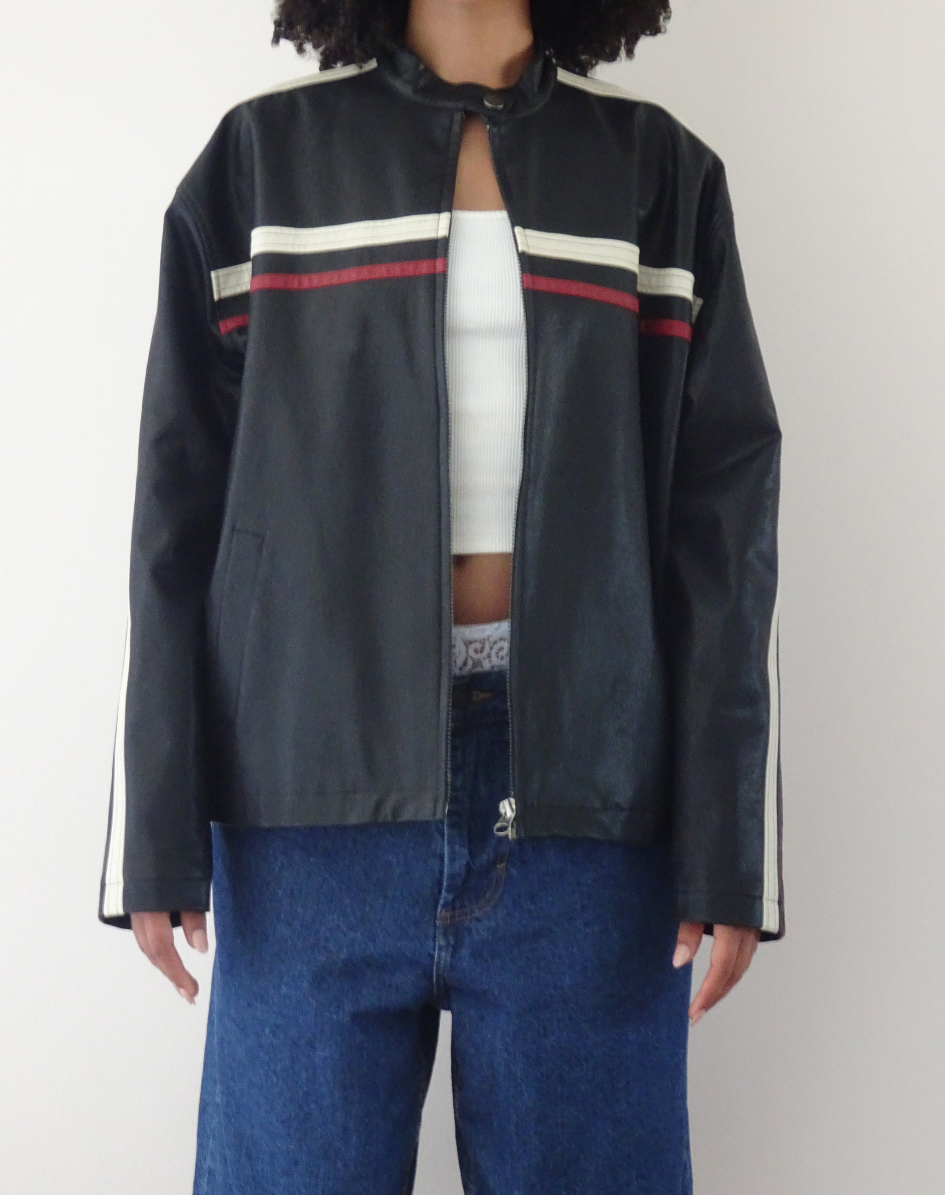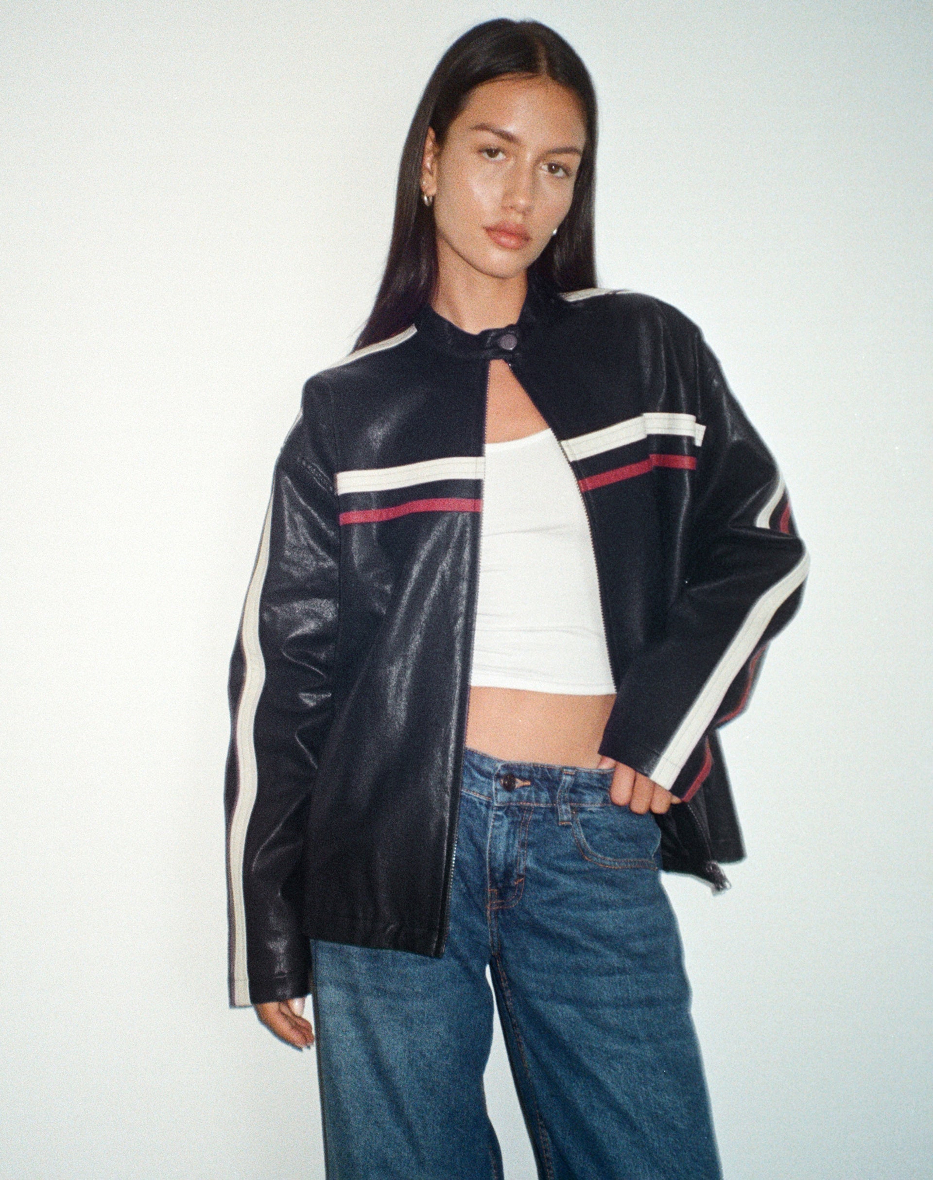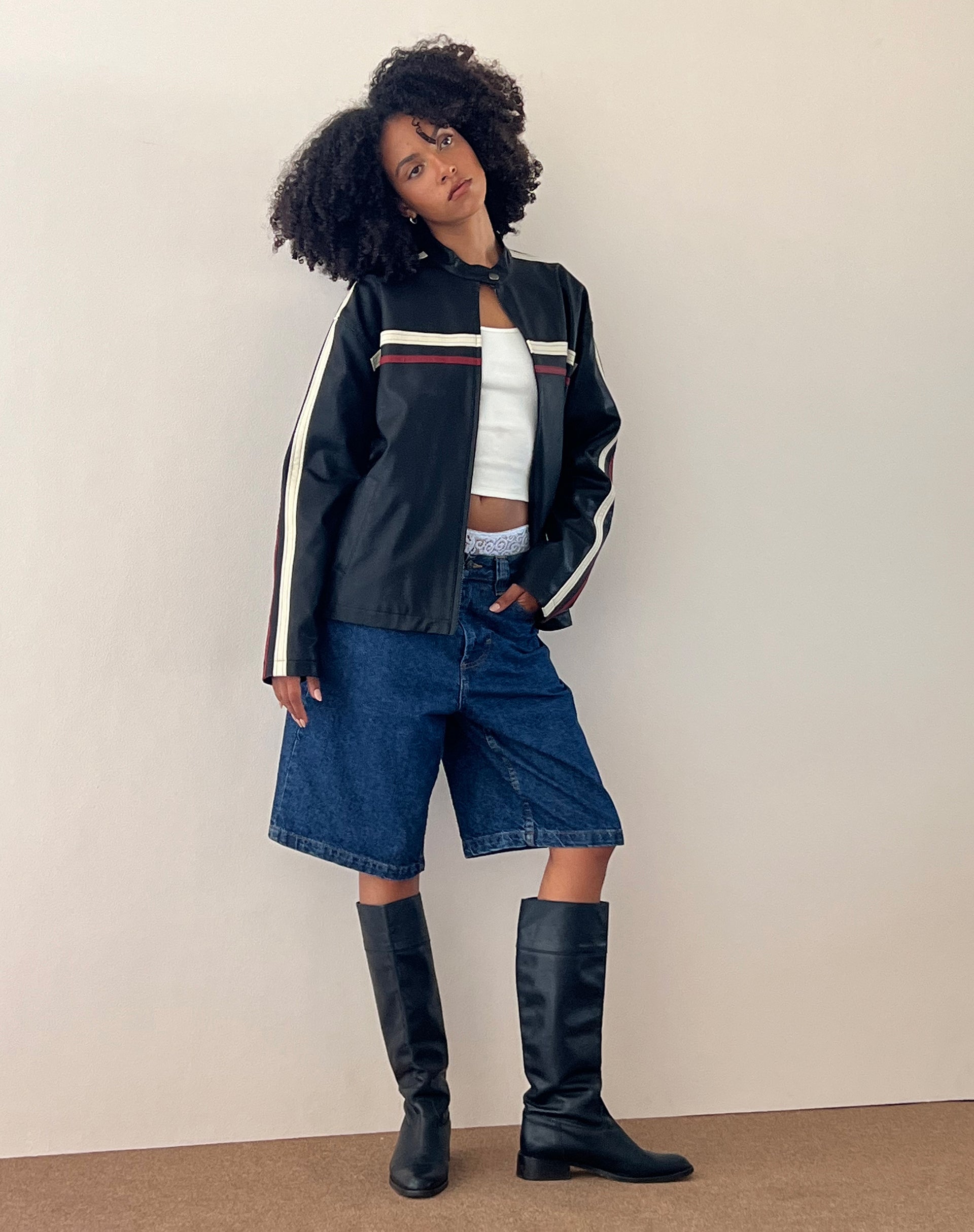 Your OOTD isn't complete without the Colton jacket. In a black PU fabric, it features a silver zip front with long sleeves and a high neckline with button clasp fastening. Detailed with ivory and red stripes across the chest and down the arms. We love to wear with our Skater short.