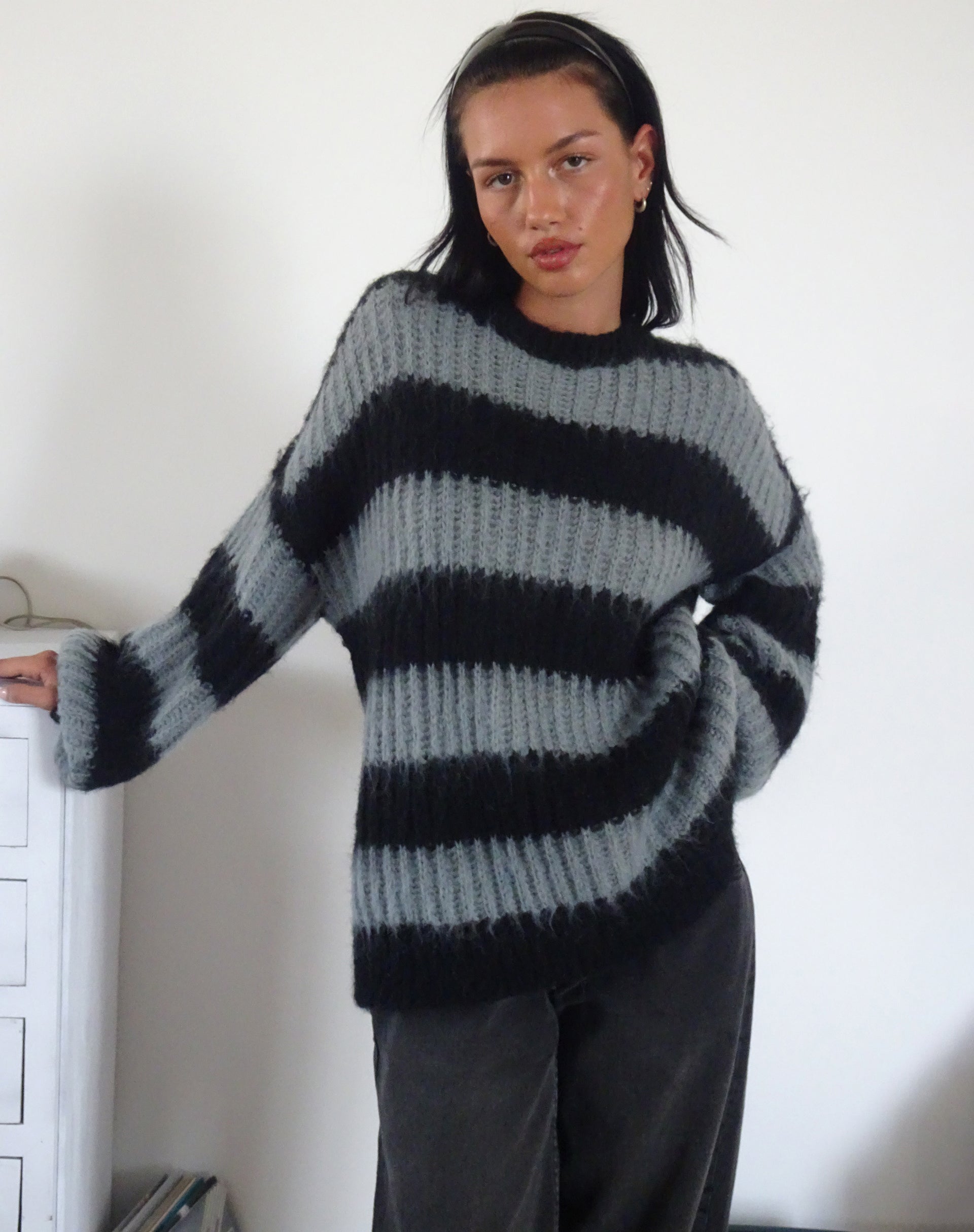 Long sleeve jumper with crew neckline in grey and charcoal stripes.