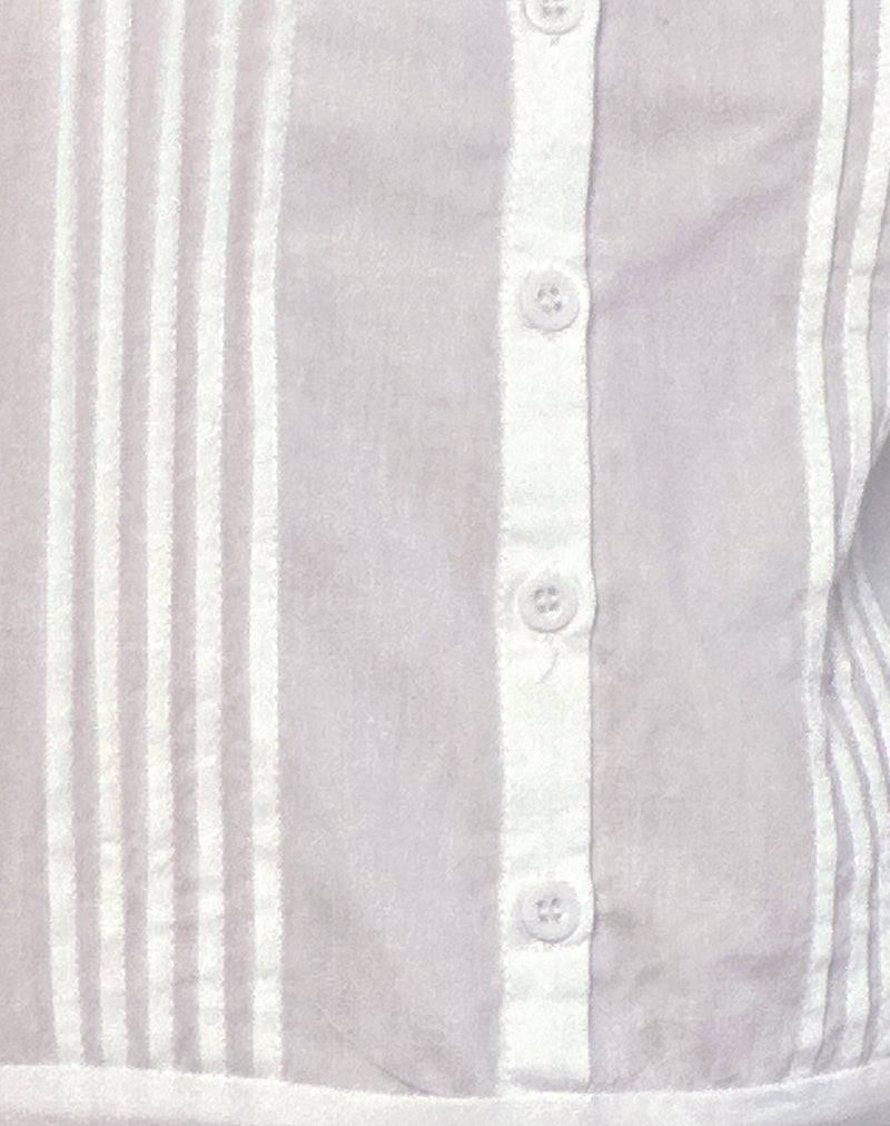 The Dayara dress in white poplin features a collared neckline with ruffle trim and button down front. A mini length hem with a sleeveless fit.