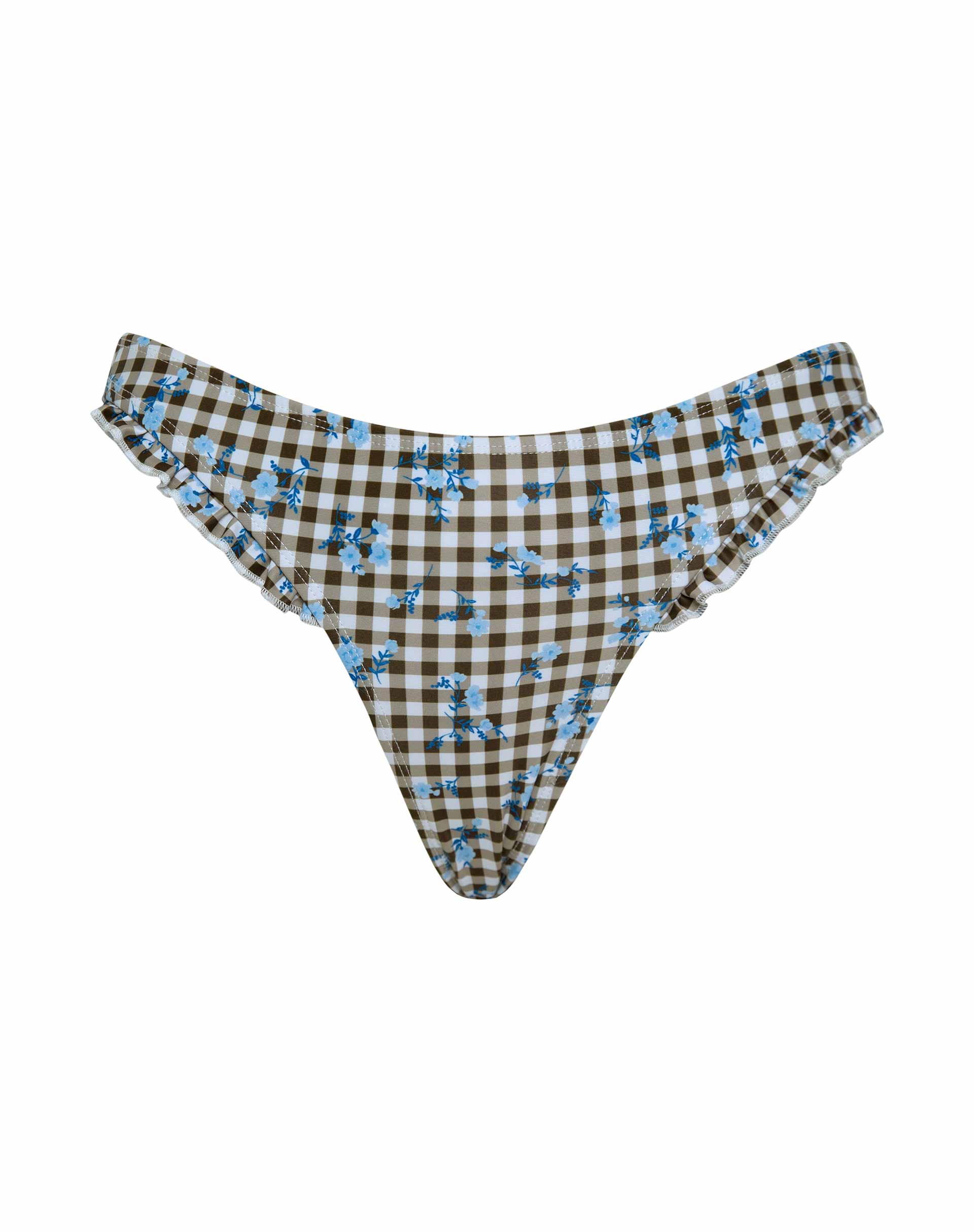 Low waist bikini brief featuring a dainty ruffle trim detailing in floral gingham brown. Wear with our matching Ricoa bikini top!