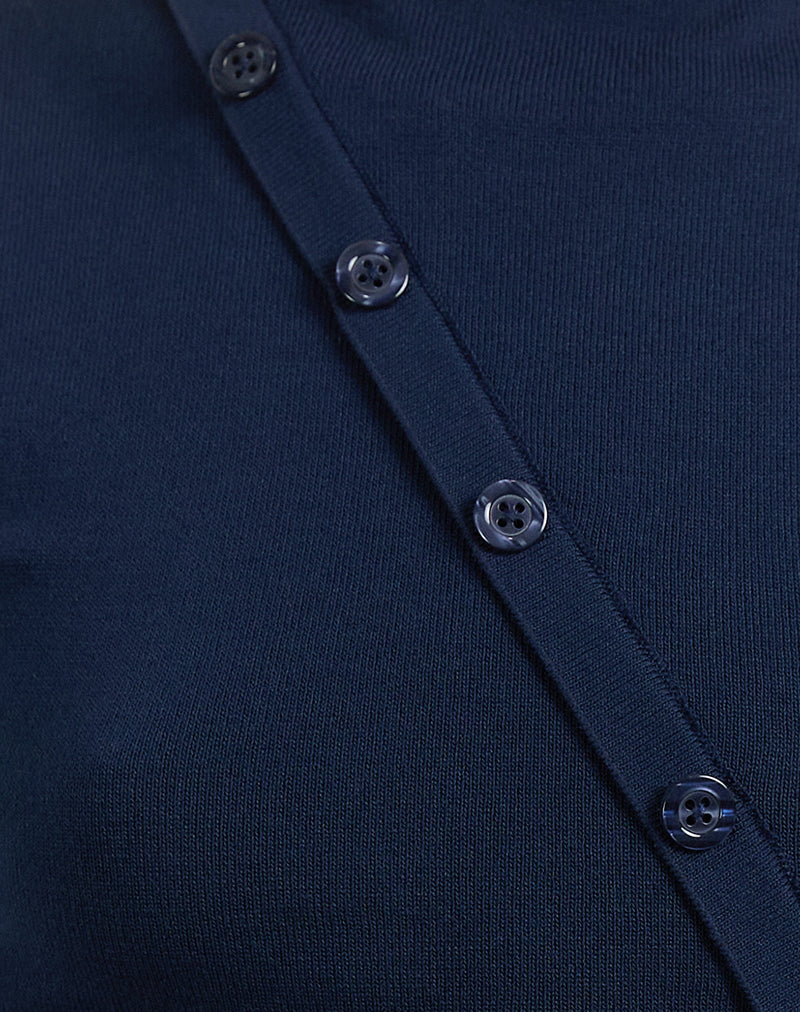The Elyra top in a navy flat knit. Fitted silhouette with a high neck and short sleeves. Features an asymmetric button detail running diagonally across the body. Pair with our Eunia shorts.