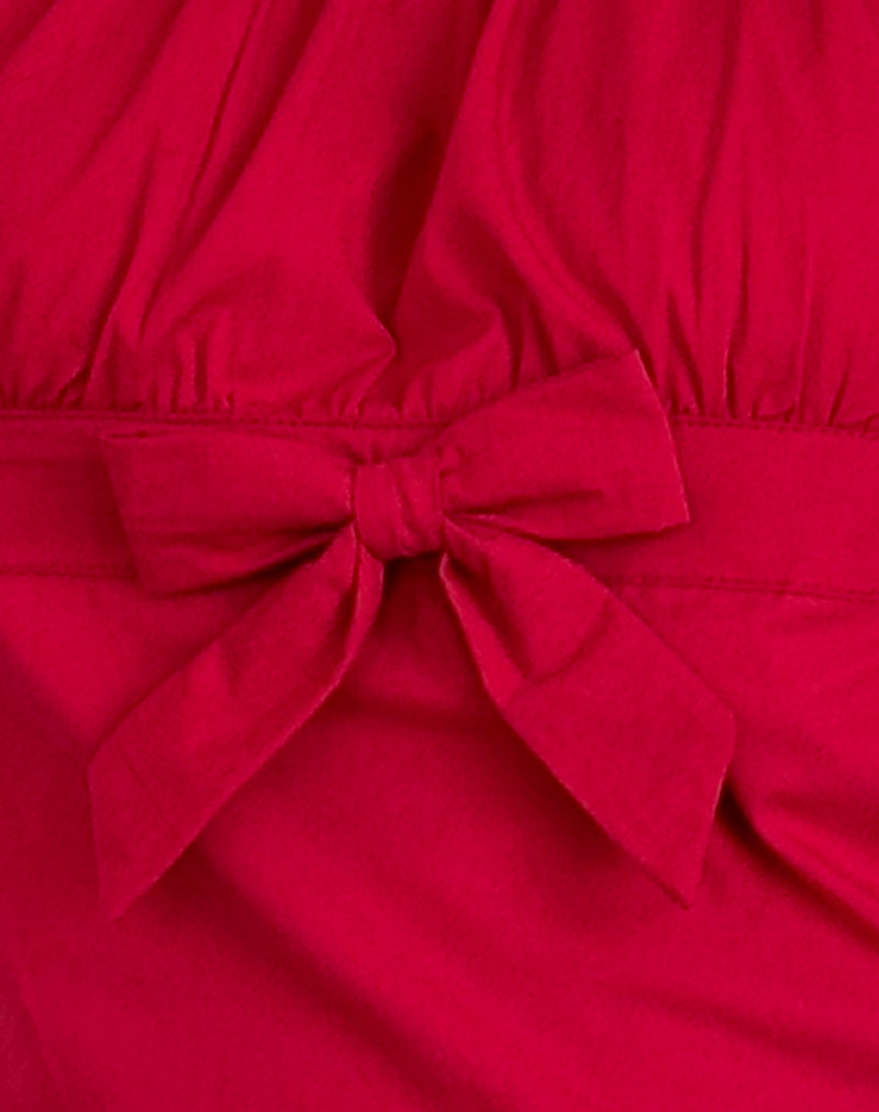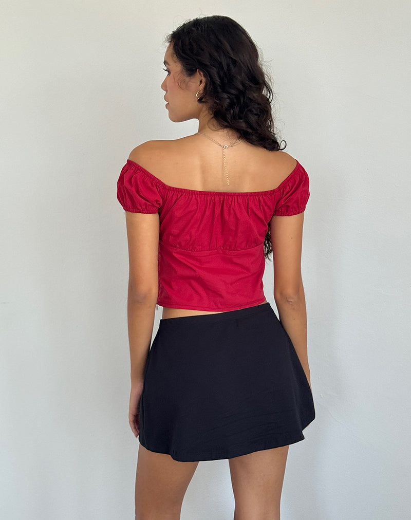 In adrenaline red, this Endah top features an off shoulder bardot design with gathered detailing and elasticated puff sleeves. Complete with red bow and belt detail on under bust in a poplin cotton fabric. We have paired ours with our Nidya mini skirt.
