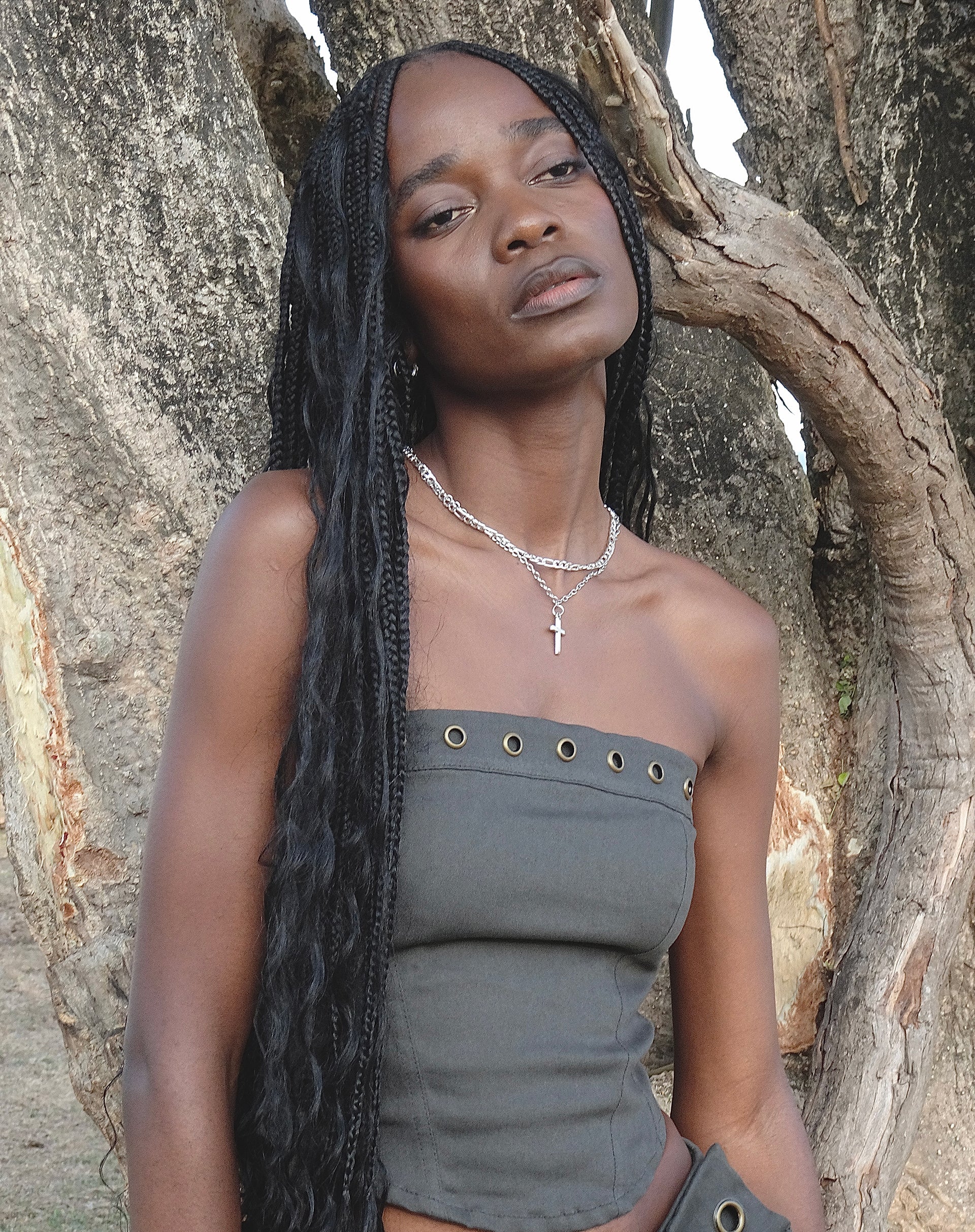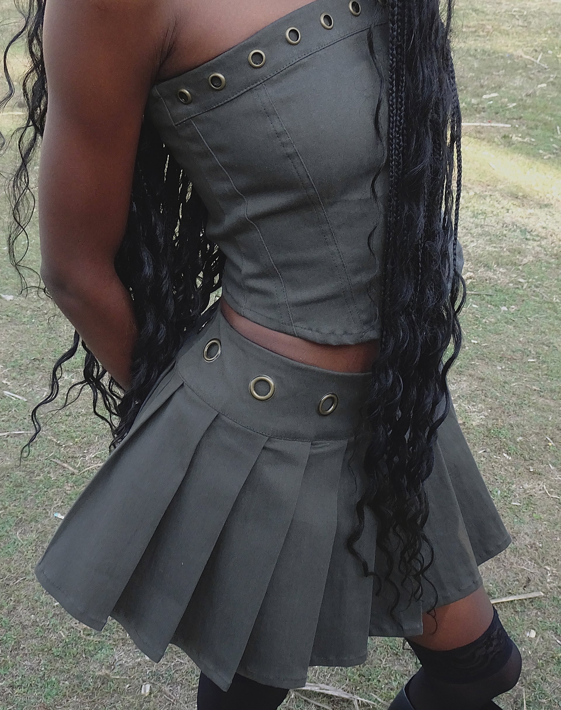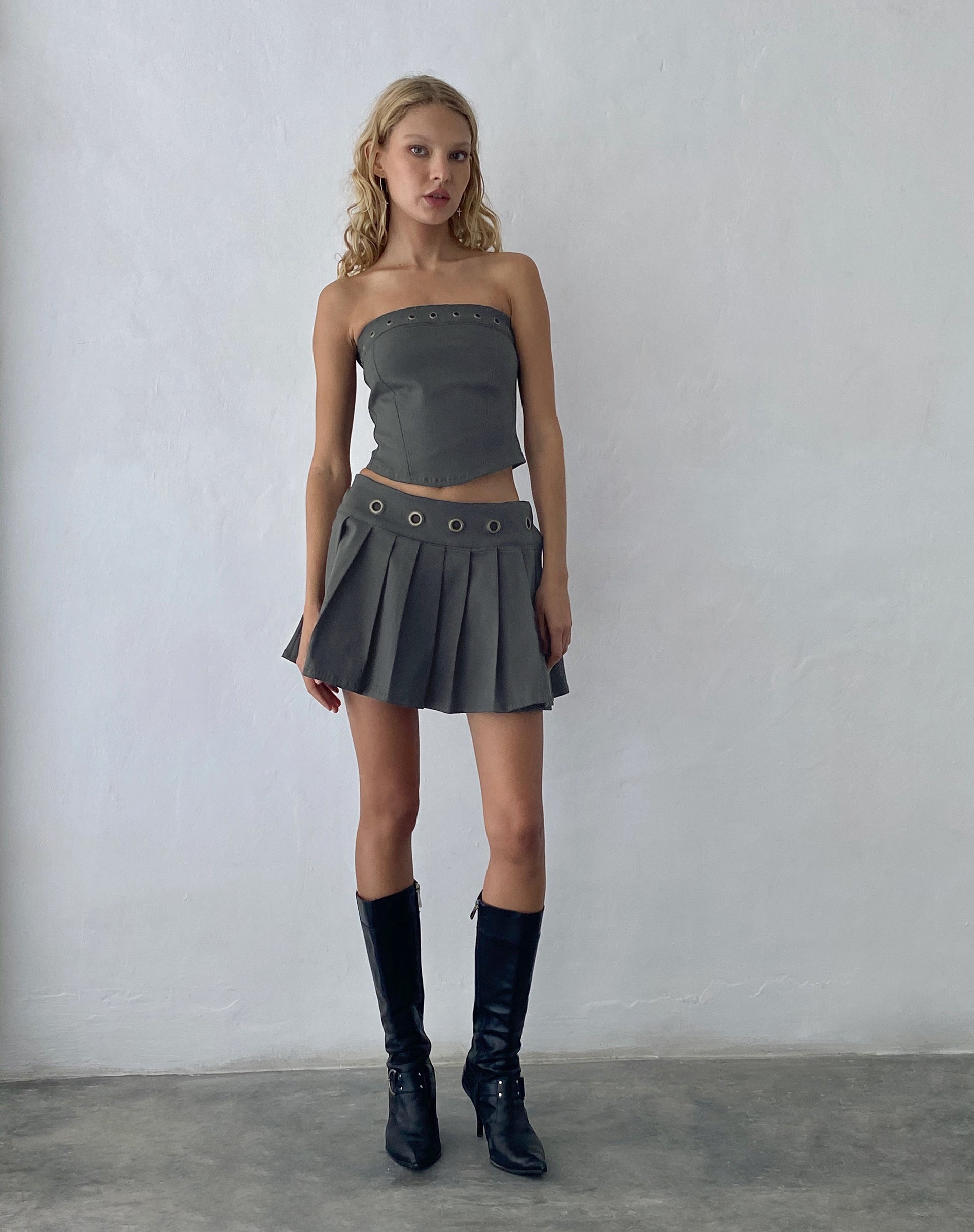 The Estel top introduces tailoring to your everyday. In a charcoal grey it features a corset body with bandeau neckline and eyelet detailing. Complete this co-ord with the matching Caluna skirt.