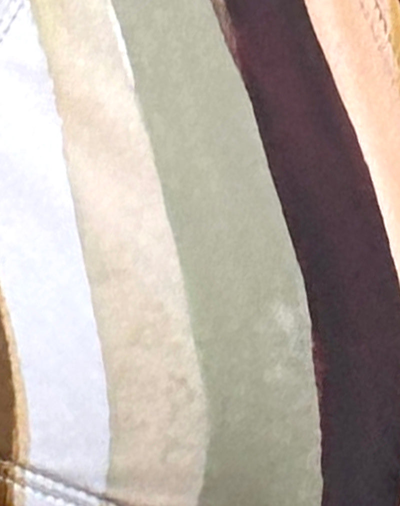 Low rise bikini bottoms with a high leg shaping in an abstract stripe in neutral tones with green and orange hues cut from stretch swim spandex made from recycled materials. Pair with the matching Laufey bikini top.