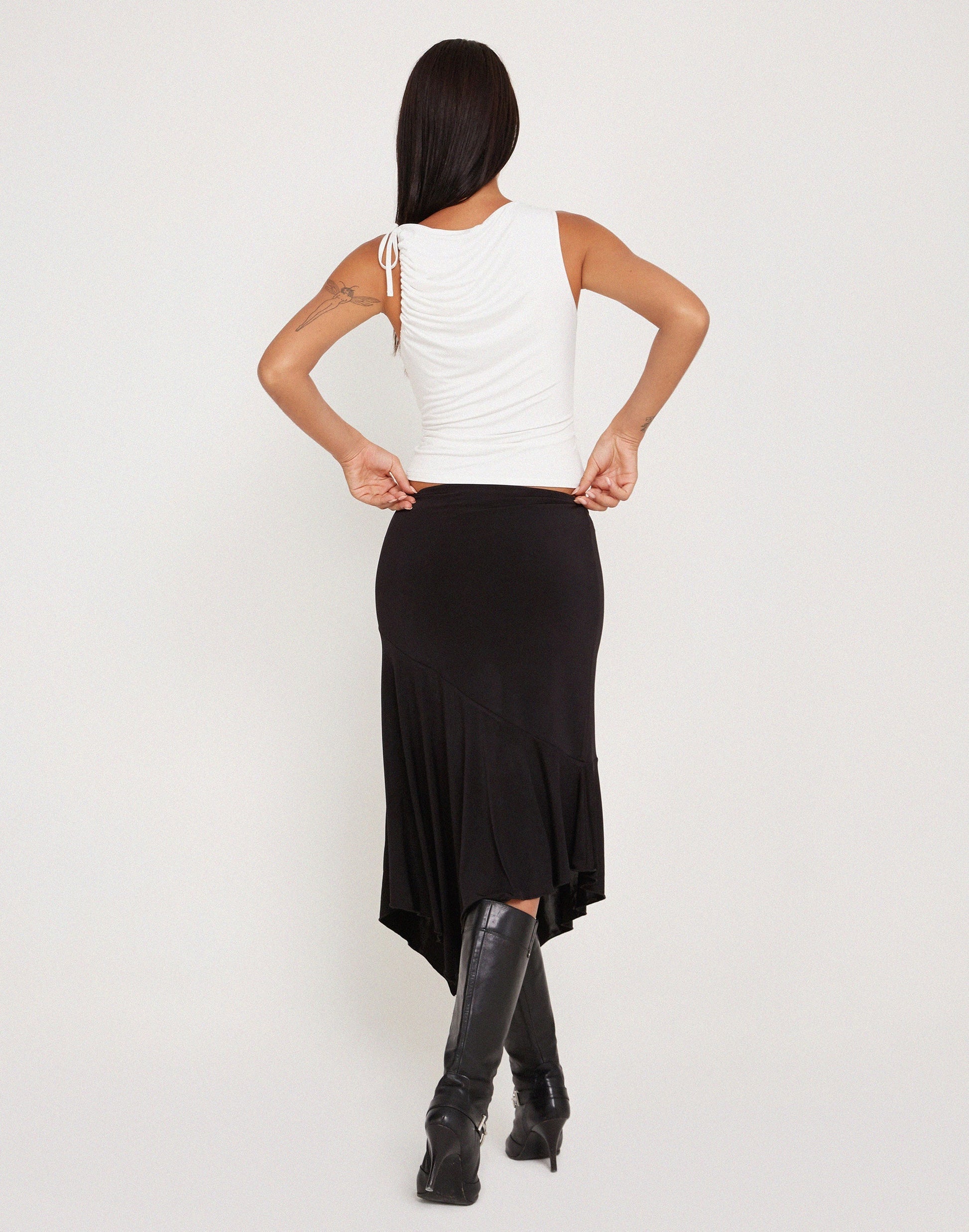 A new top for basics but with an edge. The Hagne features a high crew neckline and a sleeveless fit with ruche detailing and tie straps on shoulder in off white. Complete the 'fit with our Cinta skirt.