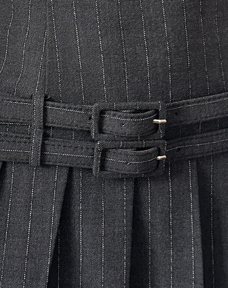 Tailor your style this season with our Haika mini dress. In a charcoal grey with white stripes, it features a bandeau mini fit with dropped waist, pleated hem and double belt detailing.