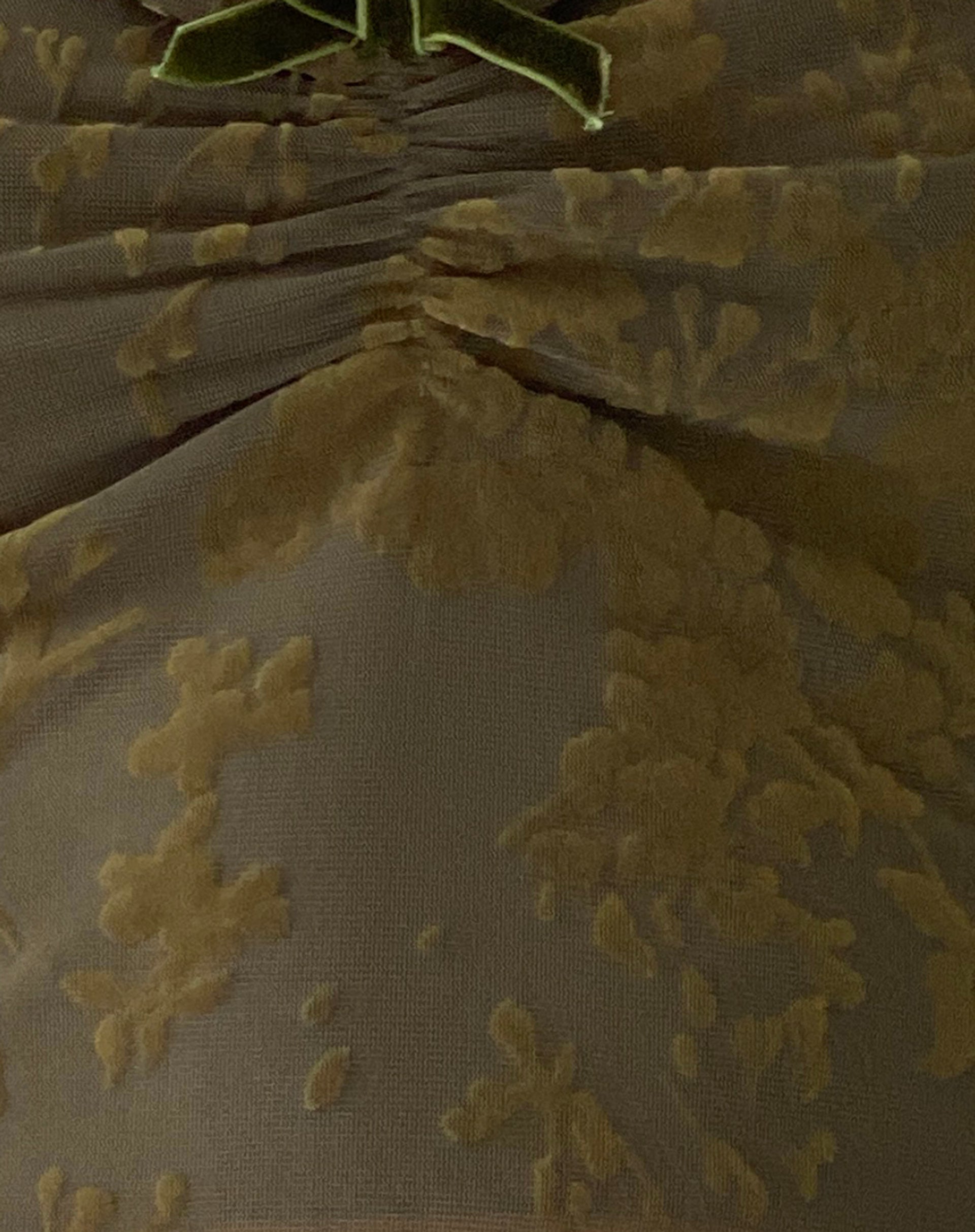 In a dark olive flocked mesh fabric, the Halusi top features a cropped design with adjustable cami straps and square neckline with ruched detailing to bust. Finished with a lettuce hem and decorative bow centre front. Complete the co-ord with the Erato skirt.