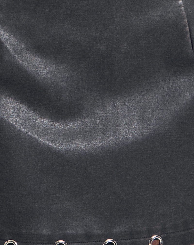 In an all over distressed PU black fabric, the Hedda skirt displays a micro length with bodycon fit. Complete with silver eyelets around the hem. We have styled ours with the Cosmo top.