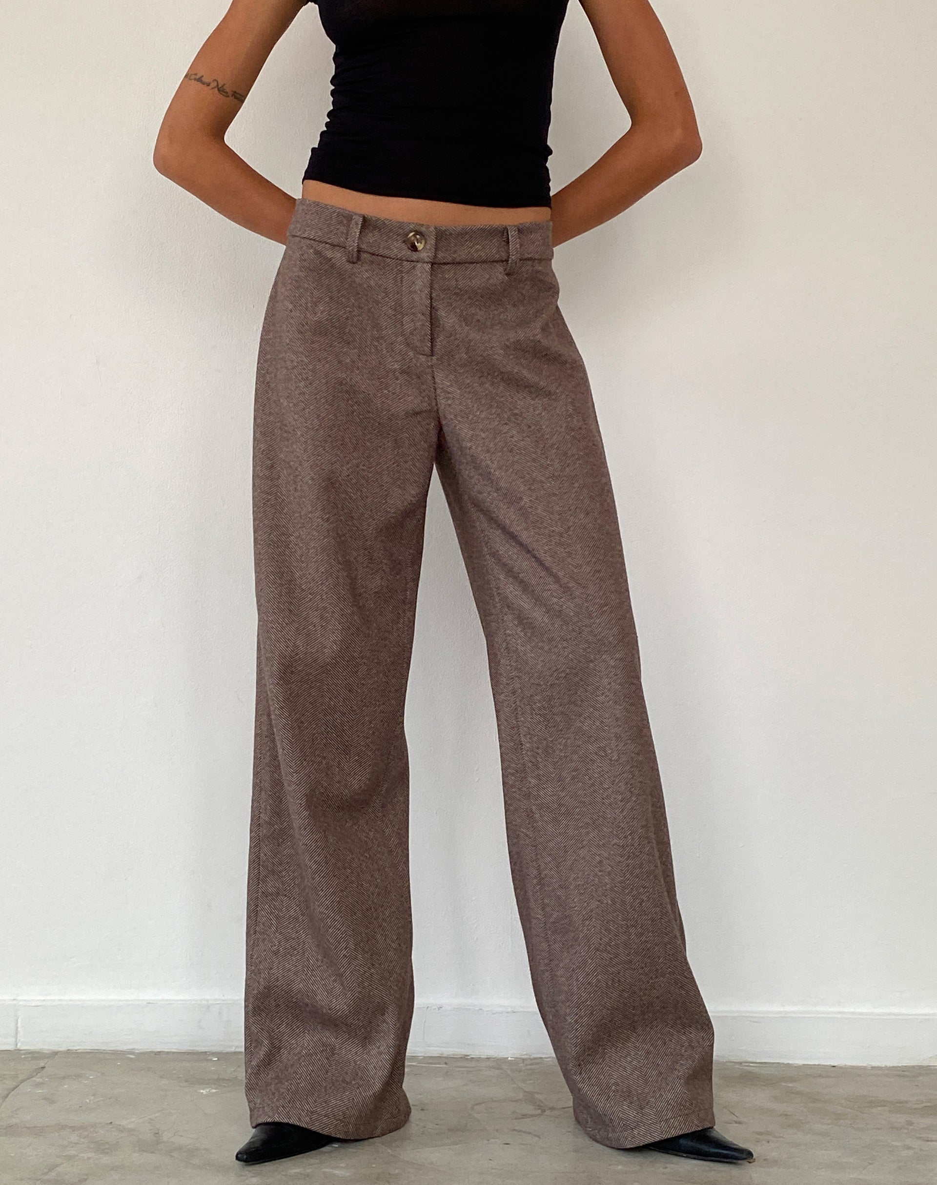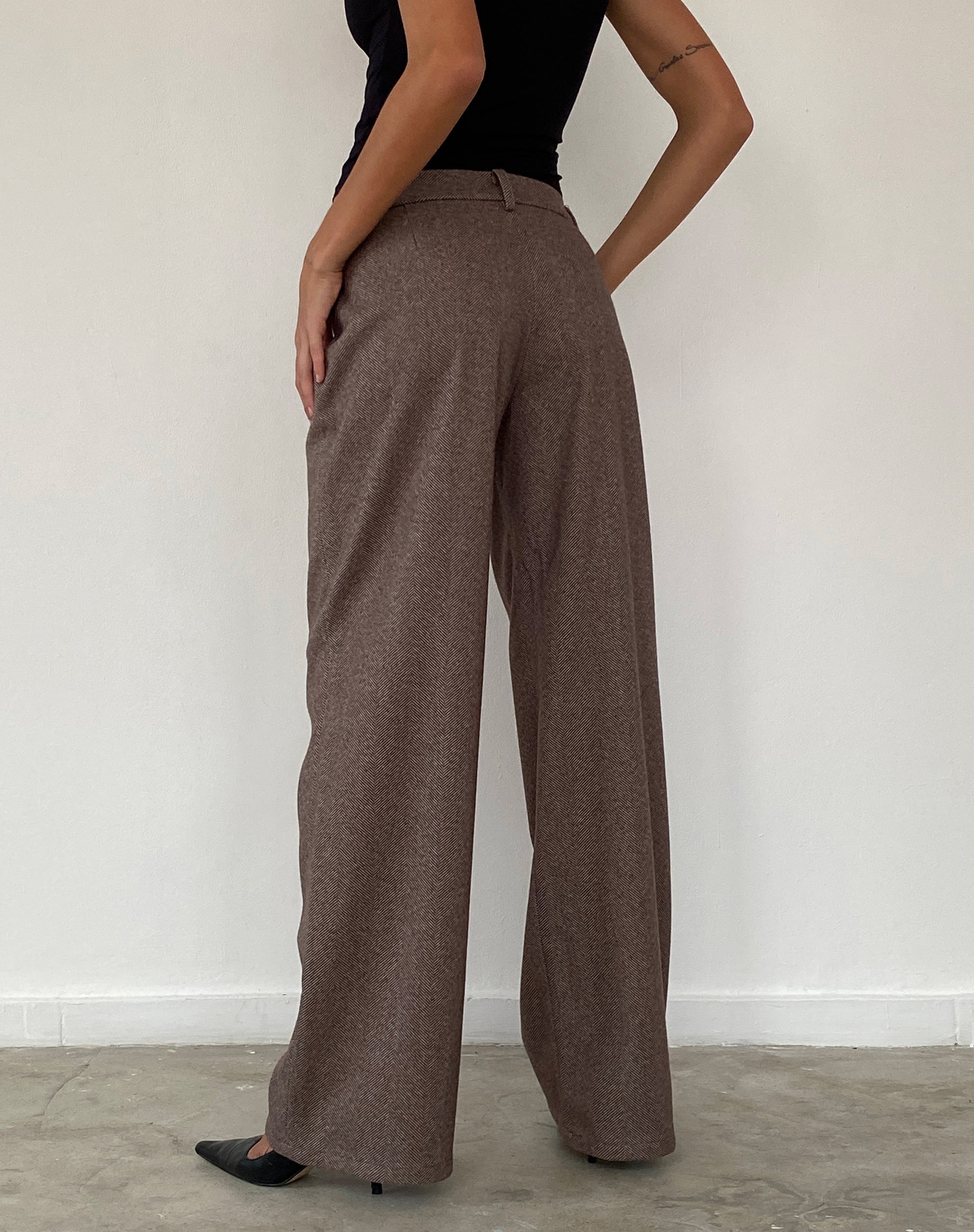 The Helsa tailored trouser boasts a low rise waist with wide legs and a zip and button fastening in a flecked brown wool fabric. Complete with pockets and belt loops. We love to wear with our Charya tee.