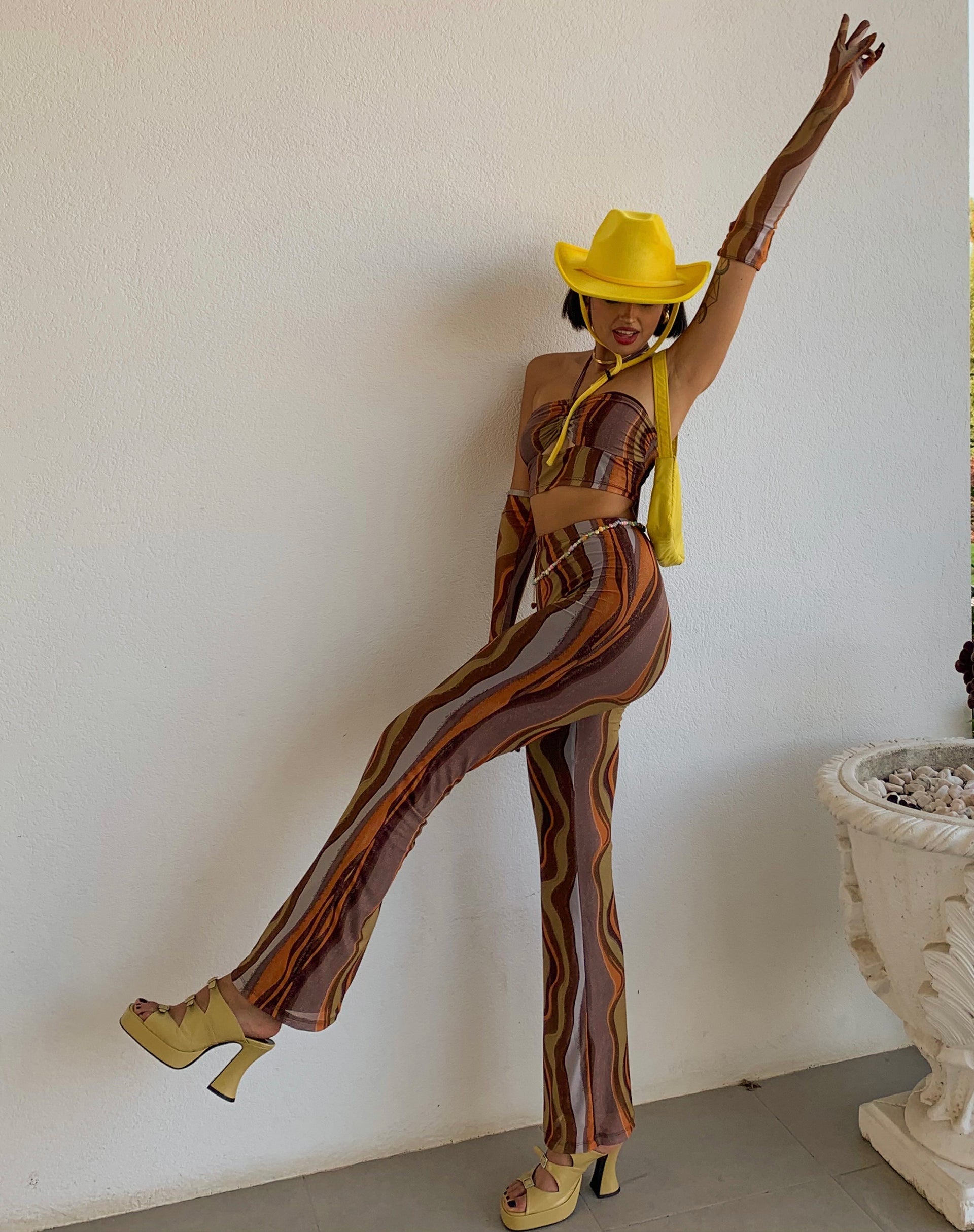 Make a statement with the Herly trousers. In an earthy gradient print, they feature a high waisted fit with flared leg. Complete the look with our matching Birka top.