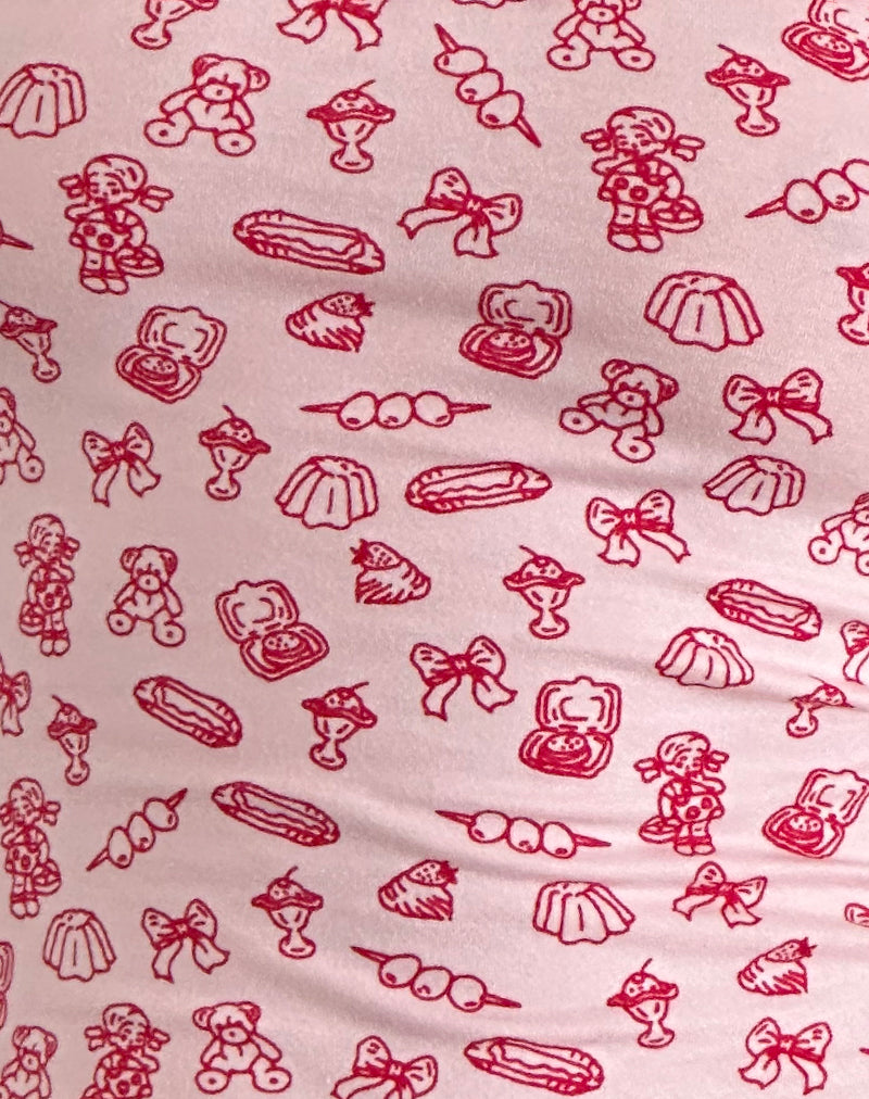 The Isna top, a cami style top featuring a regular length slim fit with thin red straps and a scoop neckline. Detailed with a decorative bow and delicate contrast binding along the chest, cut on a pink lycra fabric with all over girlie graphic print. Complete the look with our bestselling Parallel jeans.