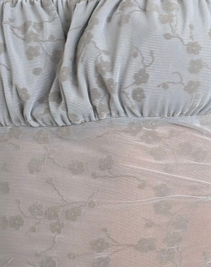 Jamet top in grey flocked mesh fabric. Features a cap sleeve, straight neckline and lined ruched panel along the bust. We love to wear with the Roomy jean.