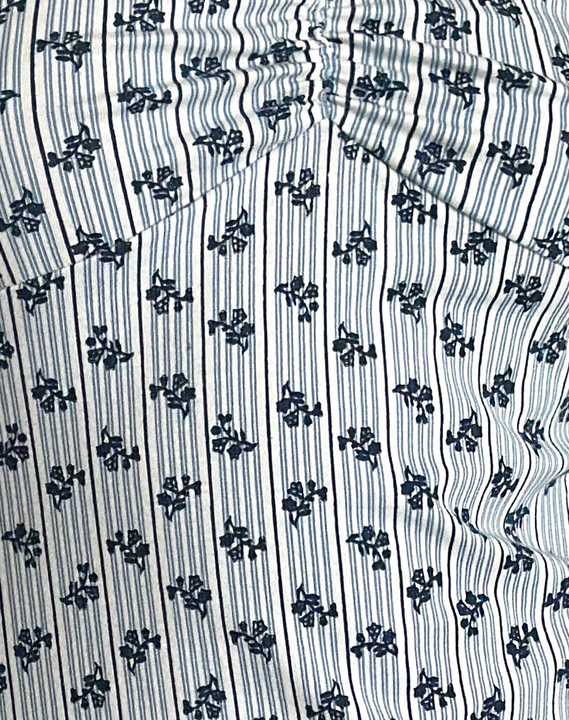 The Javaya dress, a sweetheart neck bardot dress with ruched bust, a line skirt fit, mini length. Finished with white picot trim detailing along the neck printed on a soft lycra base with a blue and navy floral stripe print.