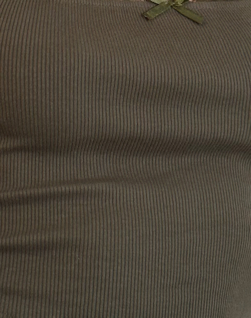In an olive jersey rib fabric, the Jinila top features a longline, bodycon fit with thick straps and a square neckline with with a lace trim and bow.