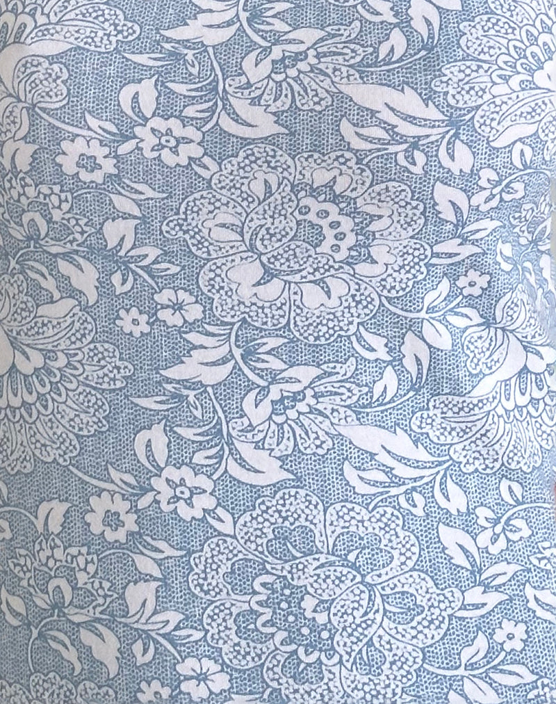 In a white ornate print on a blue lycra base, the Jinsuni dress features a bodycon fit with a mini length hem, thick straps and a square neckline. Detailed with white decorative ribbon bows on either strap.