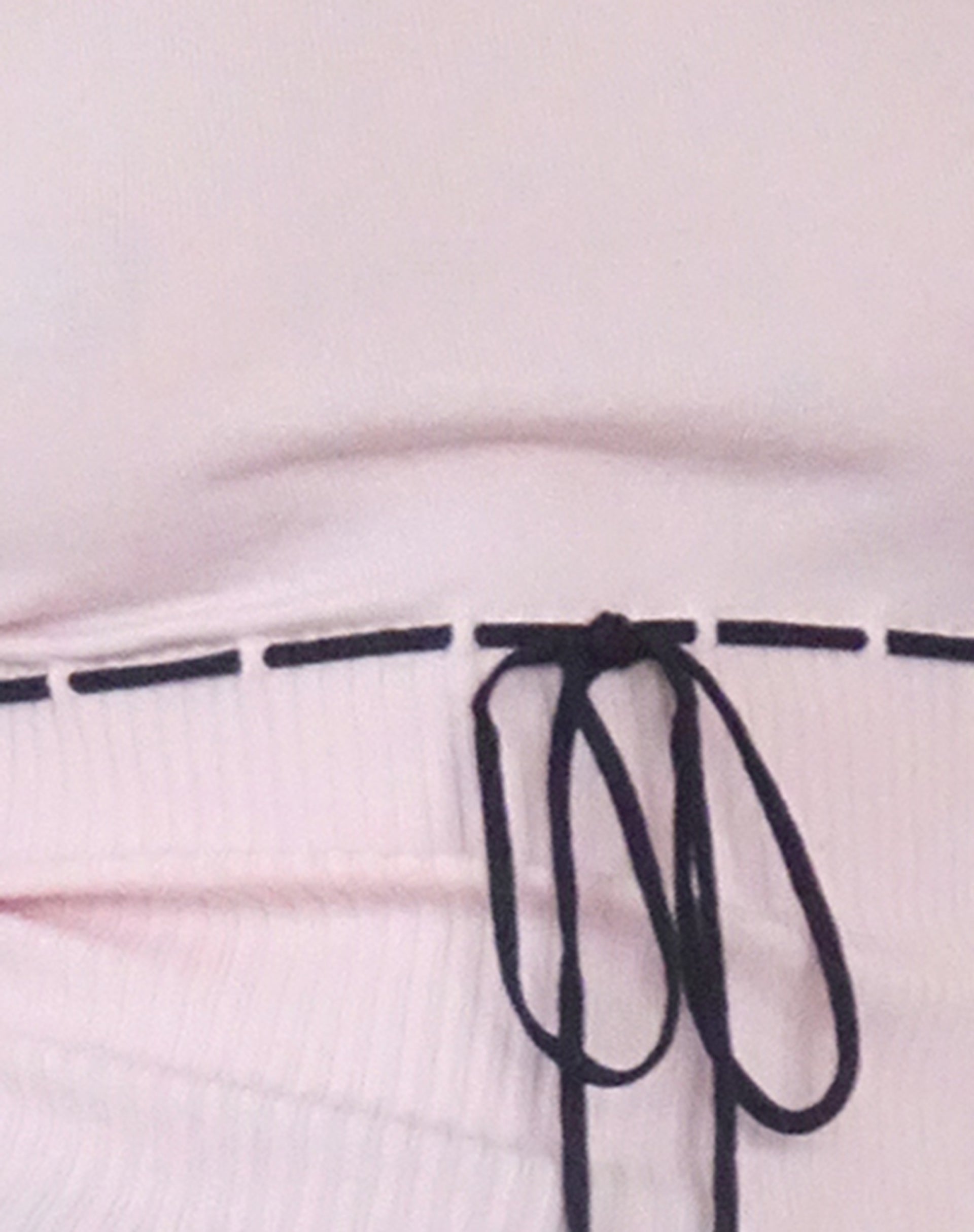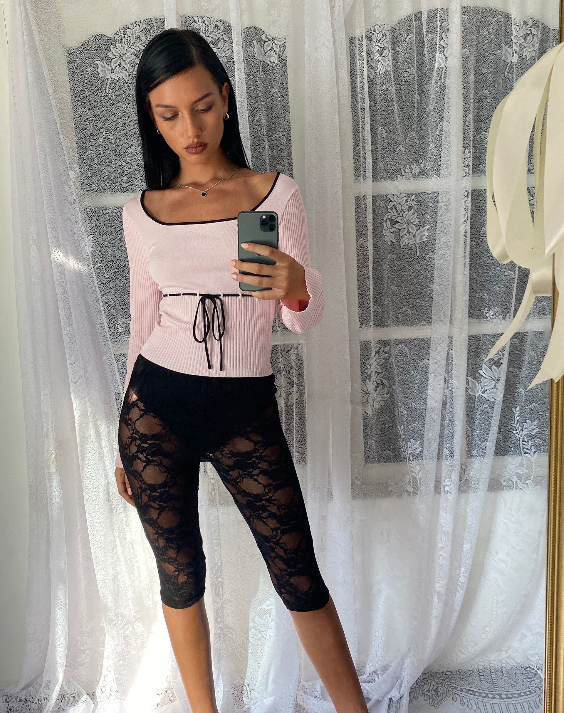 Ribbed fine knit long sleeve top in blush pink, featuring a wide neckline with black bound edges and a front tie bow. Paired with our Tuka capri short.