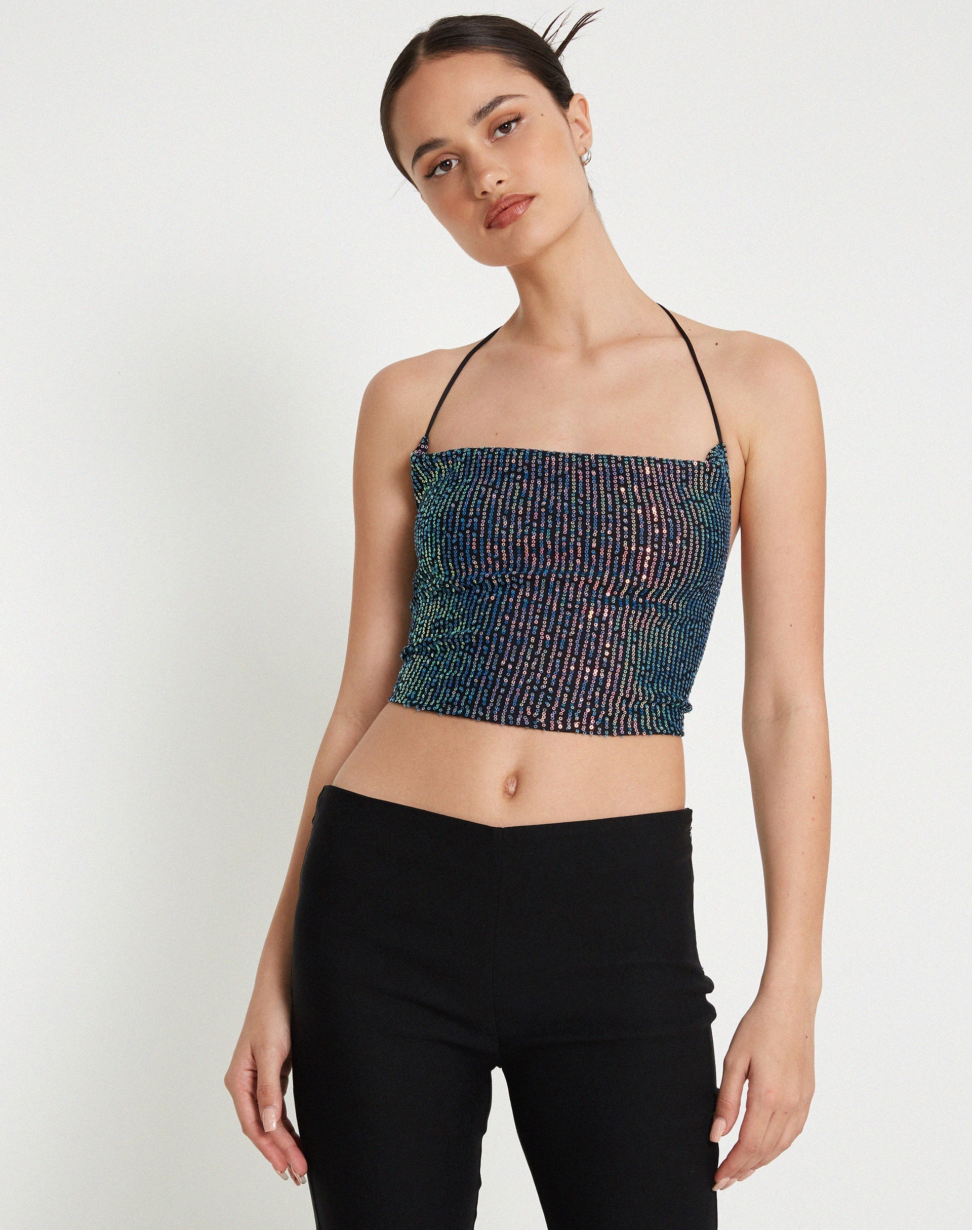 Drape front crop top in an iridescent sequin fabric, featuring a halter neckline and an open back with tie straps. We love to pair with our Levin trouser.