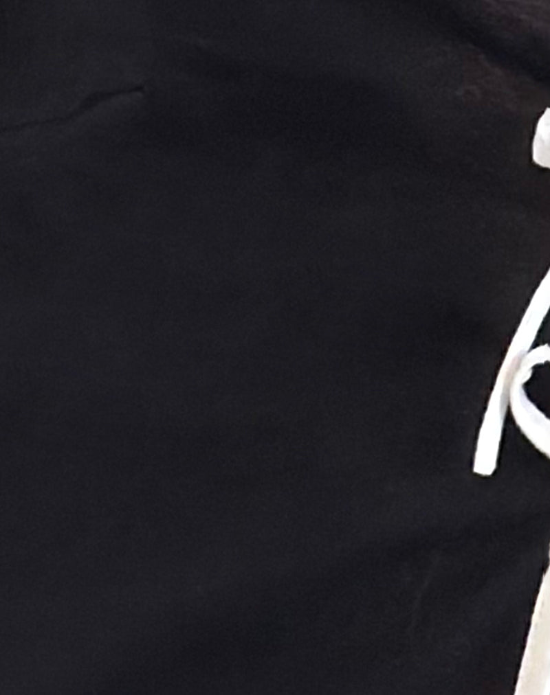 The Kayna top features a loose sleeveless fit with a 3 tie closure along the centre front with gathered waistline and crew neckline in black with white binding.