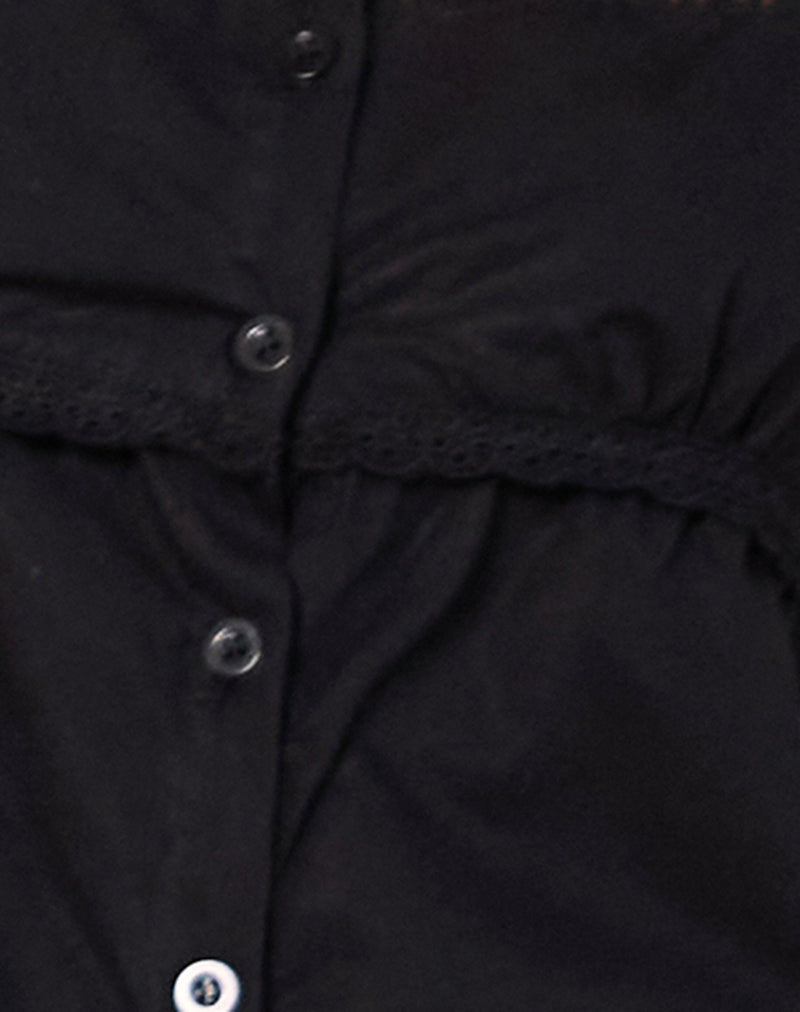 In a black poplin base, the Kenna displays a babydoll shape playsuit with bloomer shorts. Finished with a sleeveless fit, a broderie trim on the neckline and button detailing in the centre front.