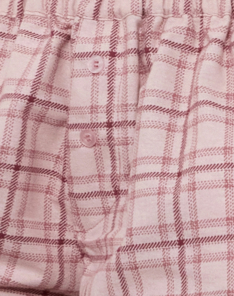 Our Laboxe shorts feature a low rise boxer short fit with fly button detail and elasticated waistband. Complete with side pockets in a pink tartan print linen fabric. Style with our Hevalis top.