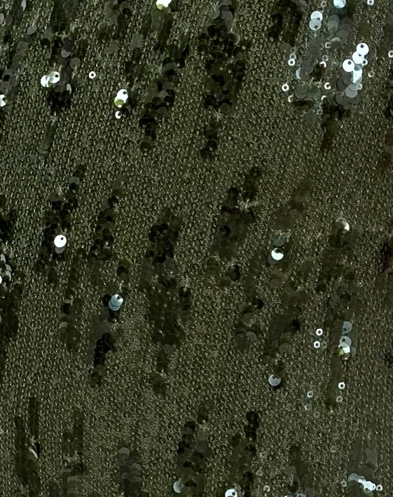The Lalaurie dress in khaki mixed drape sequin fabric. Mini style dress with a scooped neckline, thin straps and a slight bodycon fit.