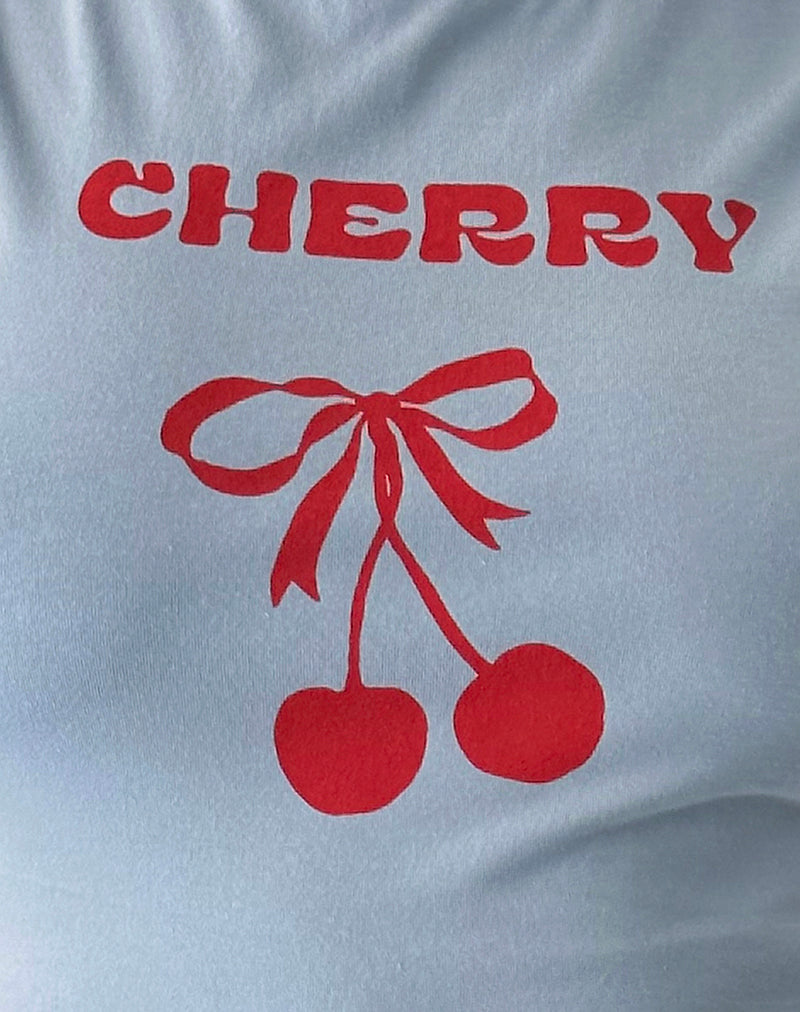 In a nantucket blue jersey fabric, the Leen top features a sleeveless design, crew neckline and bodycon fit in a regular length. Complete with cherry print. Finish the look off with our Farida bikini bottoms.