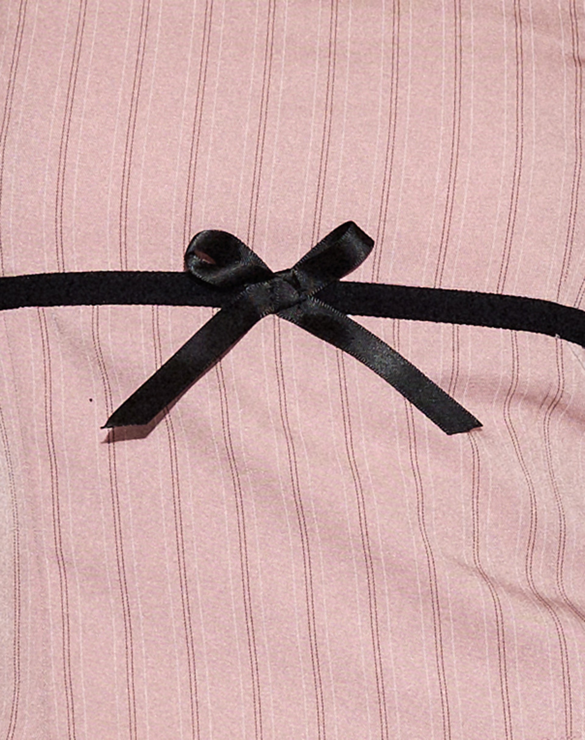 Our Leggy top features a sleeveless, bandeau design with a slim fit, curved neckline and pinstripe print in a blush stretch tailoring fabric. Complete with black ribbon detailing and a decorative bow to under bust. Get the look with our Istaka skirt.