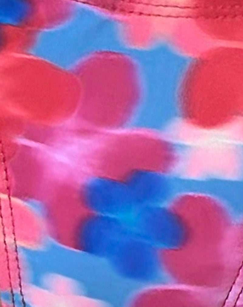 Super low rise brazilian cut bikini bottoms with adjustable ties at each side in an all over blurred floral print in blue, pink and purple tones on eco swim fabric. Complete the set with matching Pami bikini top.