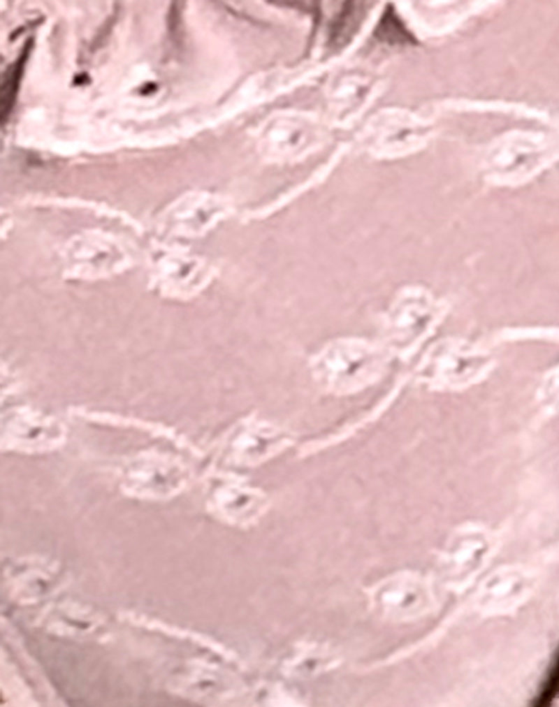 Super low rise brazilian cut bikini bottoms with adjustable ties at each side finished with a frill along the waist line in a blush pink broderie swim fabric.