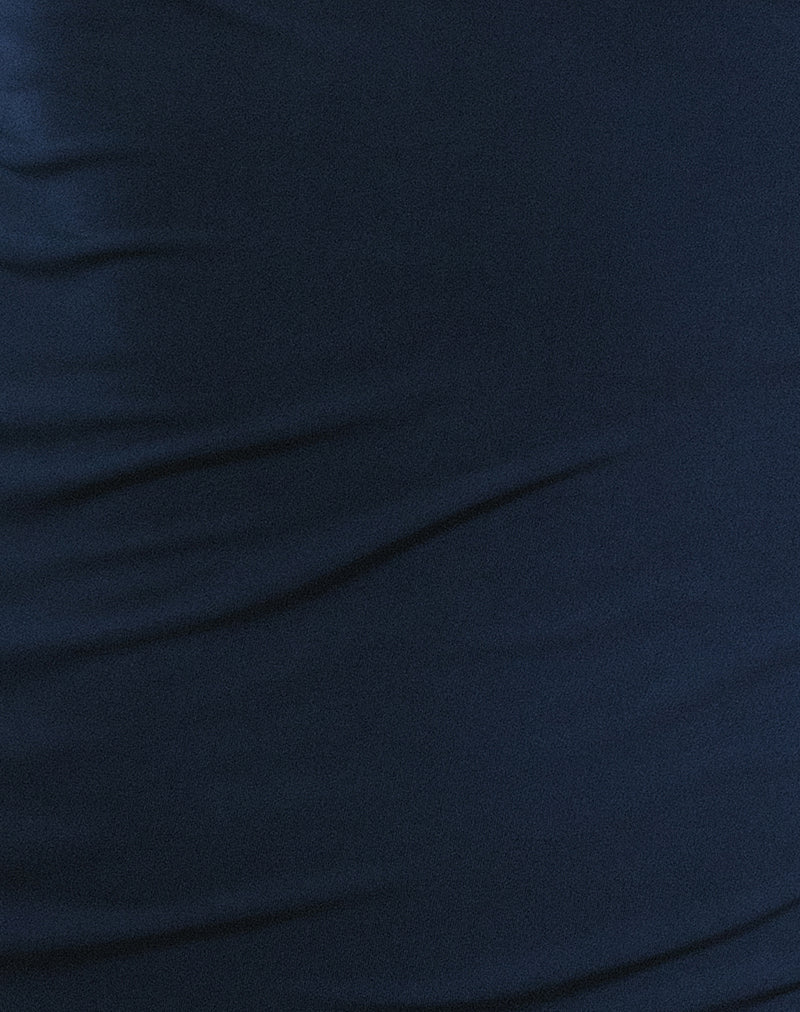 In a slinky navy fabric, the Leona dress features a one-shoulder, bardot design with a bodycon fit and thick, twisted straps in a mini length.