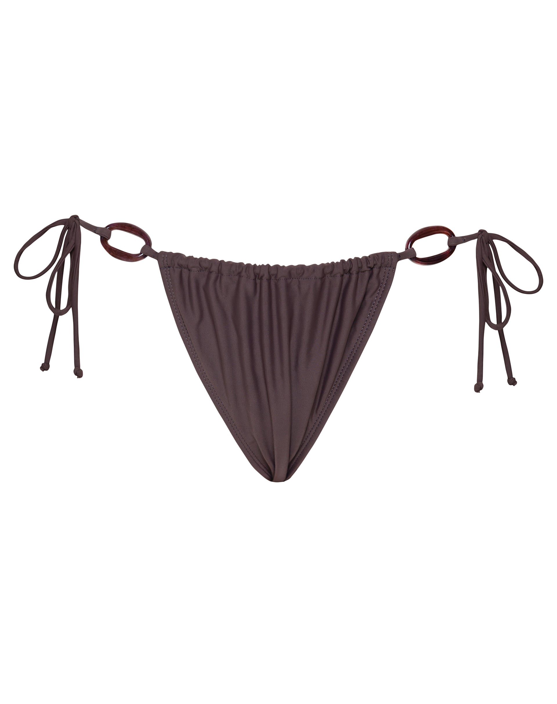 The Leyna bikini bottoms have a low rise fit and adjustable ties and ruching at the front and back, featuring oval trims at the side in comes a rich coffee brown colour. Style with our Pami Bikini Top.