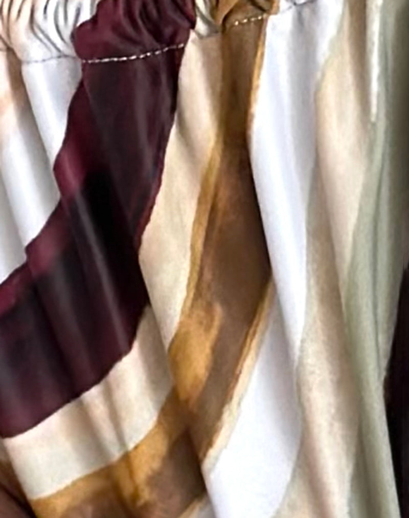 Low rise bikini bottoms with adjustable ties at each side and ruching on the front and back for adjustable coverage in an abstract stripe in neutral tones with green and orange hues cut from stretch swim spandex made from recycled materials. Pair with our Pami Bikini Top.