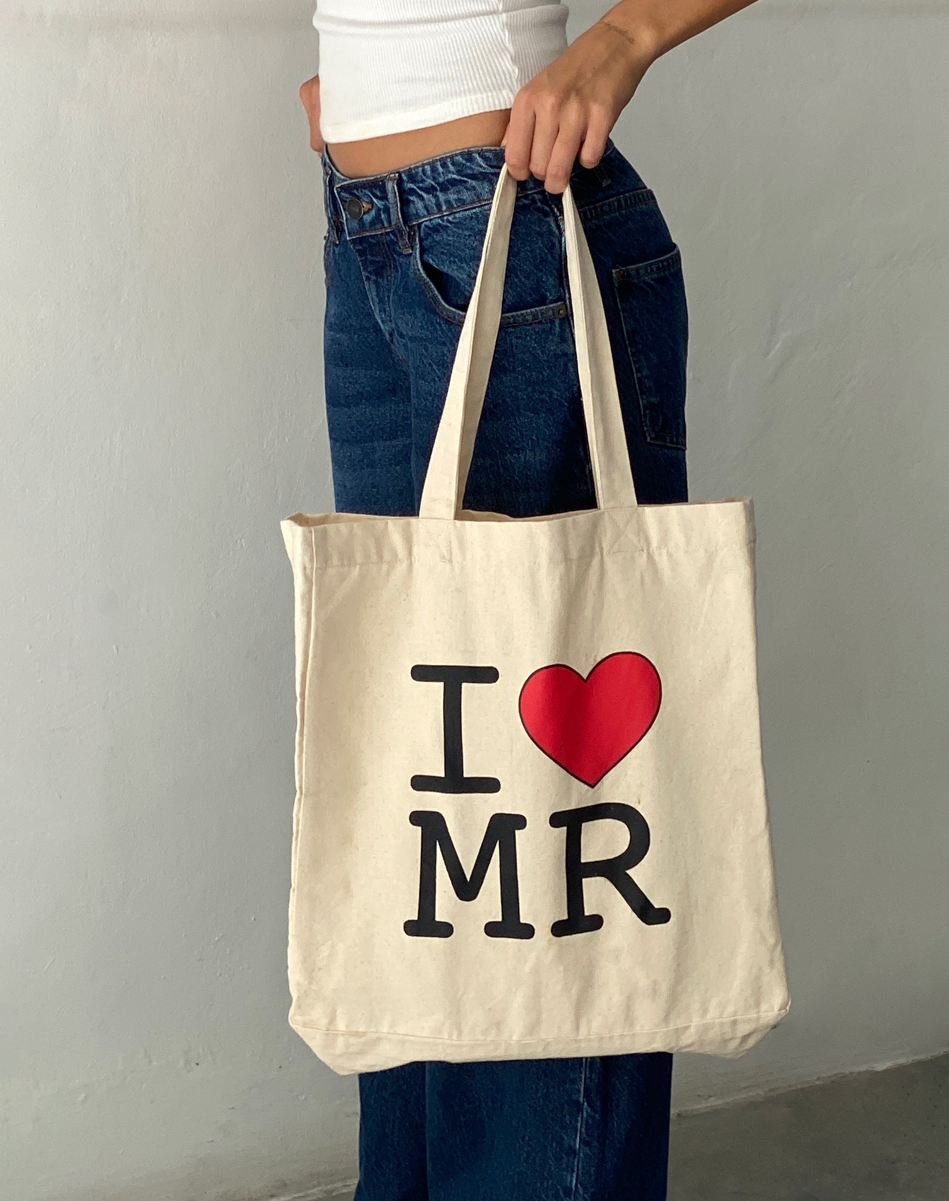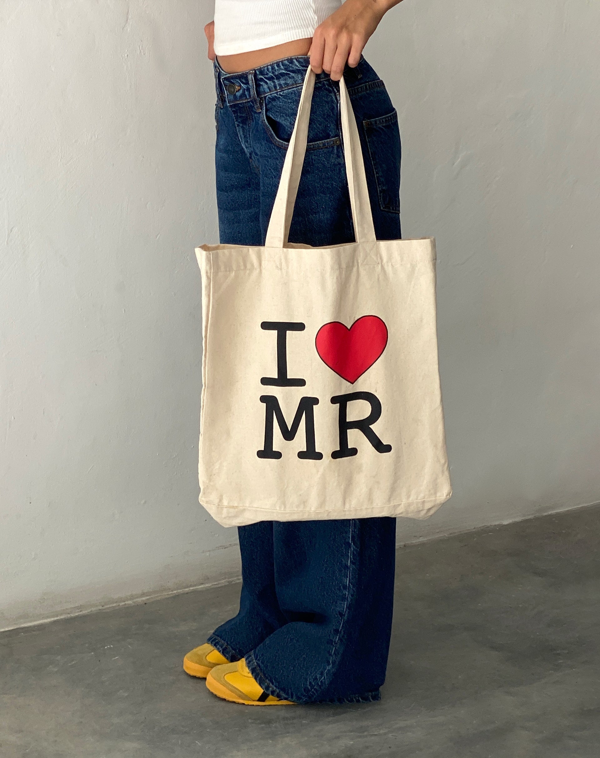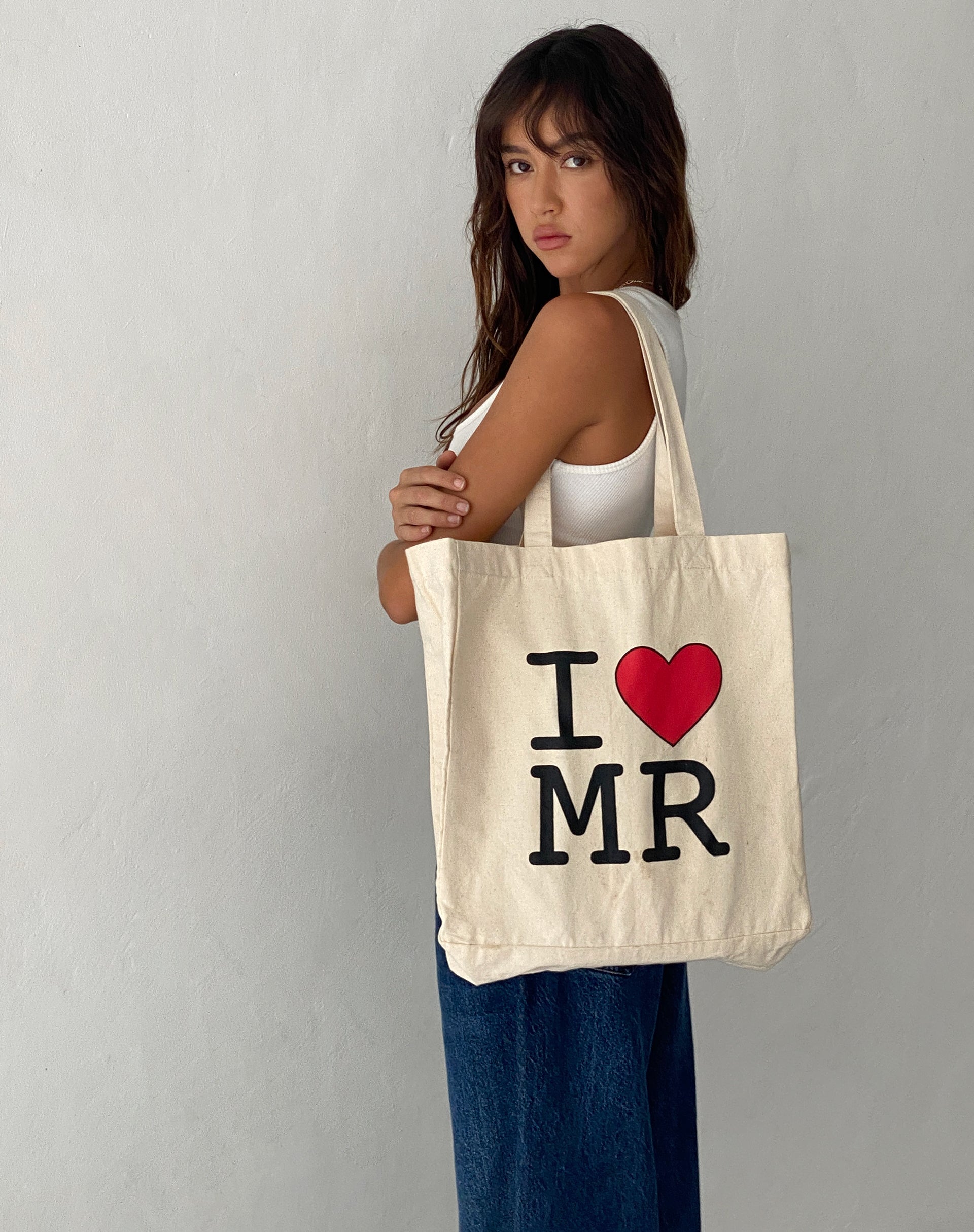 Whether you're popping to the shops or having a day at the beach, this tote is the bag for you. Featuring a square body with chunky straps in off white with 'I HEART MR' print in black and red.