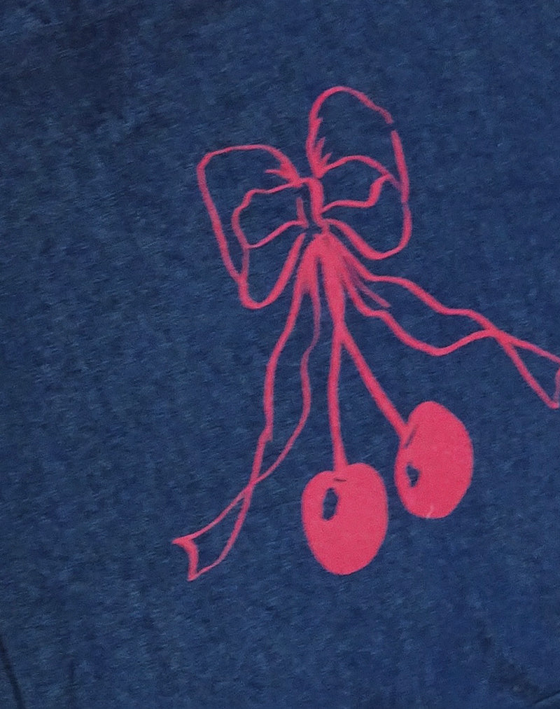 The perfect accessory for this season. In indigo denim this London tote features a square body with chunky straps with bow and cherry print in red on front.
