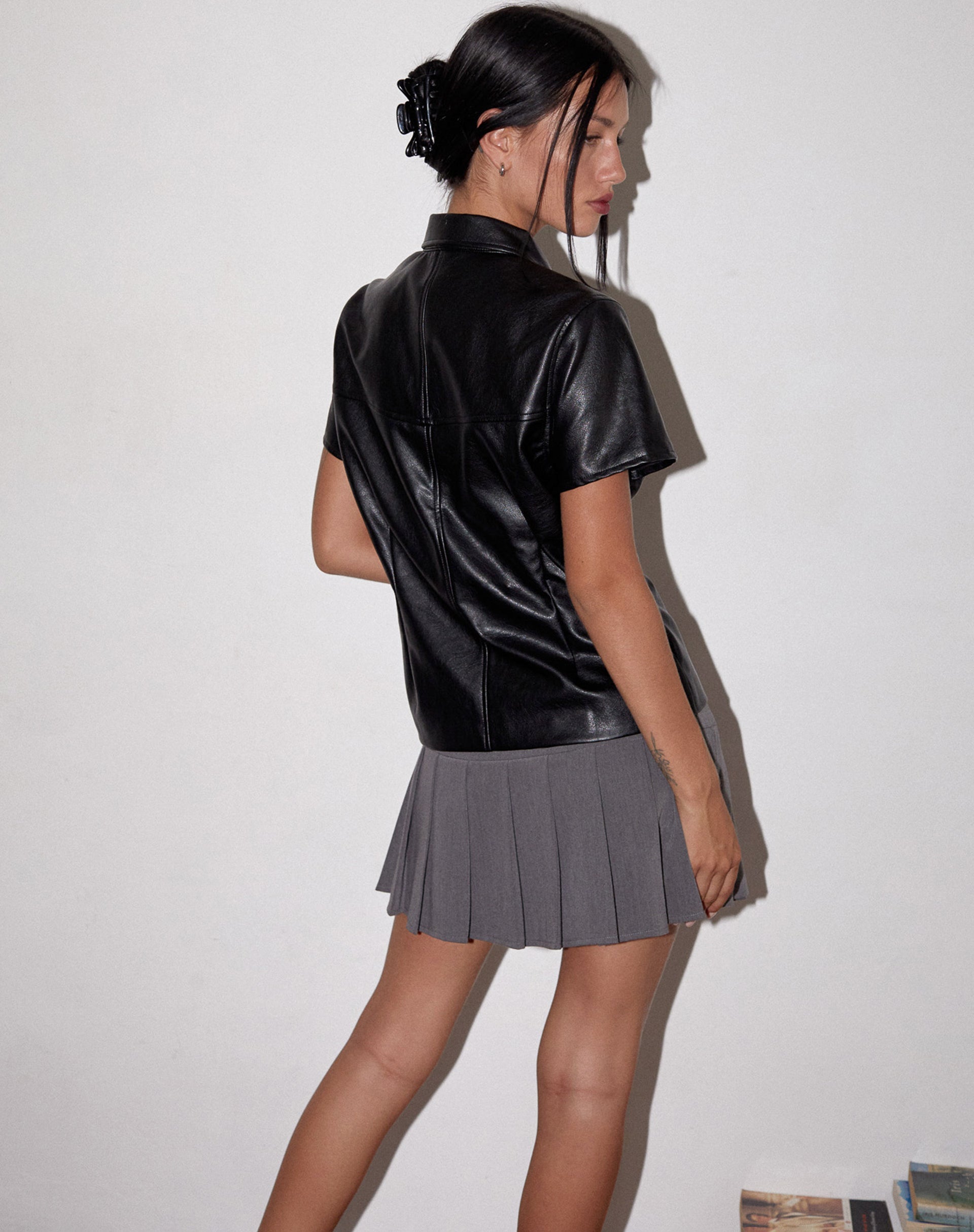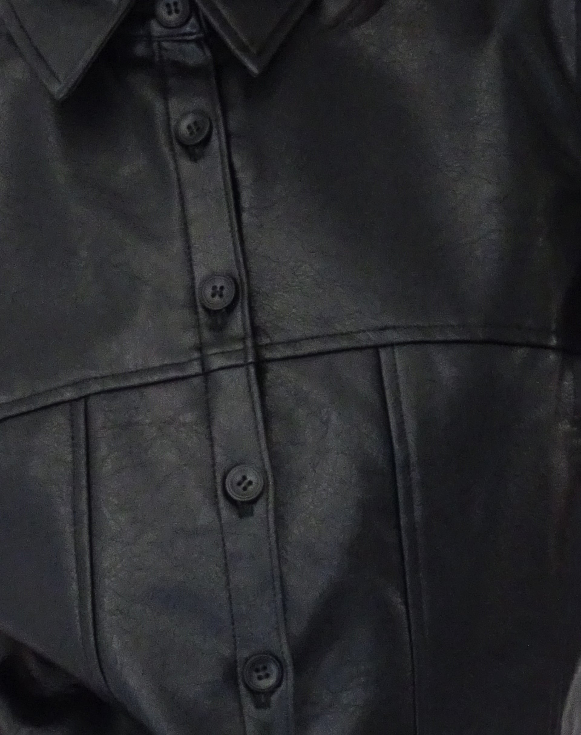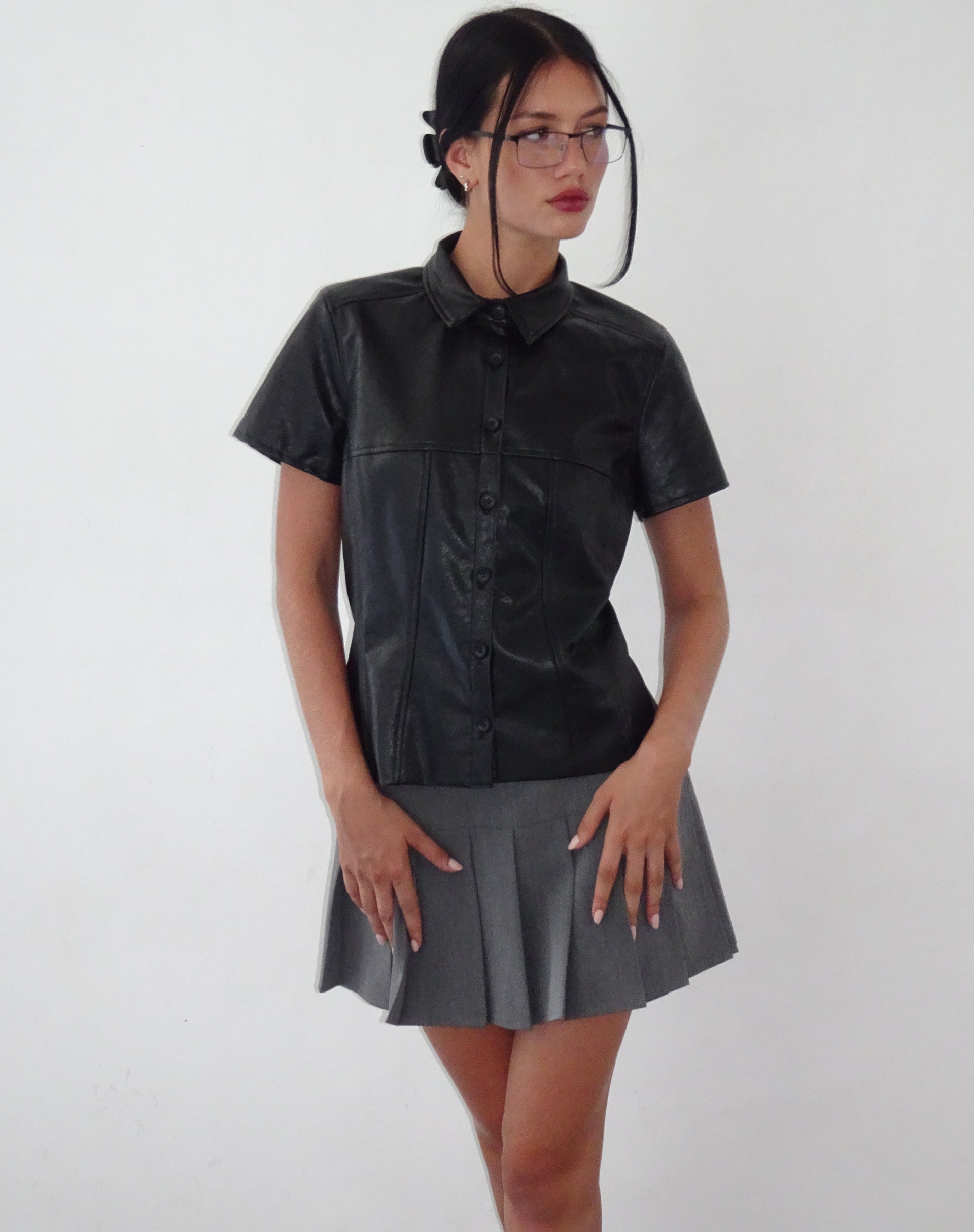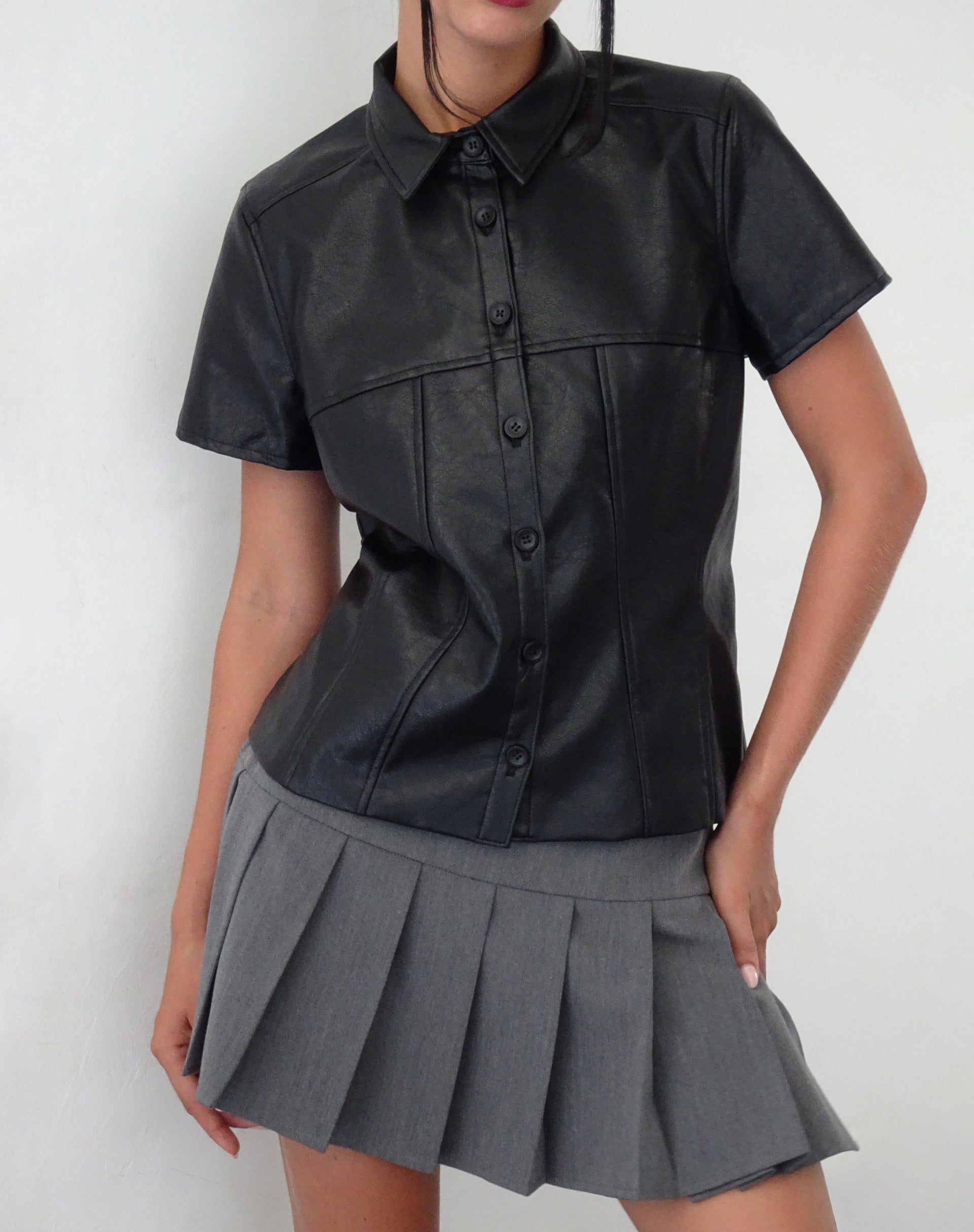 It's PU season. The Mulan shirt features a short sleeves fit with butten fastening on front and collar detail in black pu with black stitching detail.