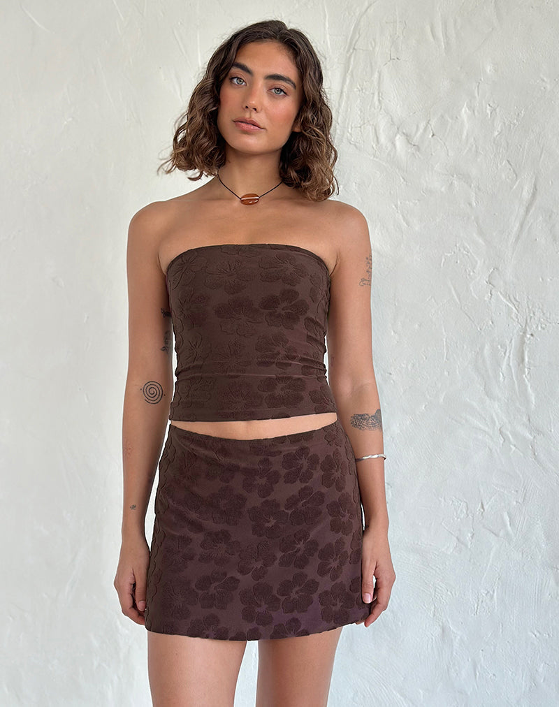 Low rise mini skirt in a soft stretch terry towelling fabric with an all over hibiscus flower jacquard in a dark brown finished with an elasticated waist and slight a line shape.