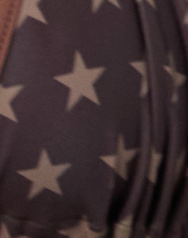 A Halter neck triangle bikini top with adjustable ties at the neck and at back in a tonal brown star print with contrast binding. Cut from stretch swim spandex. Complete the set with our matching Leyna bikini bottoms.